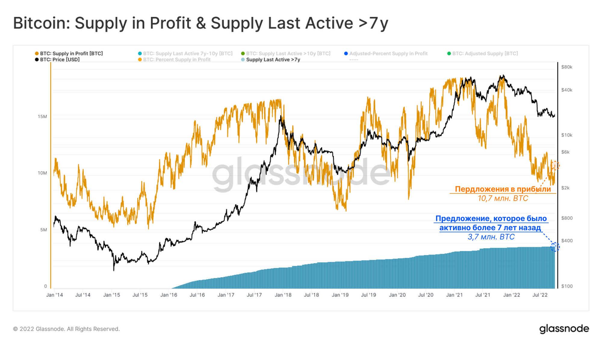 В настоящее время 3,7 млн биткоинов неактивны за последние 7+ лет, что составляет 34% от текущего Предложения в прибыли.