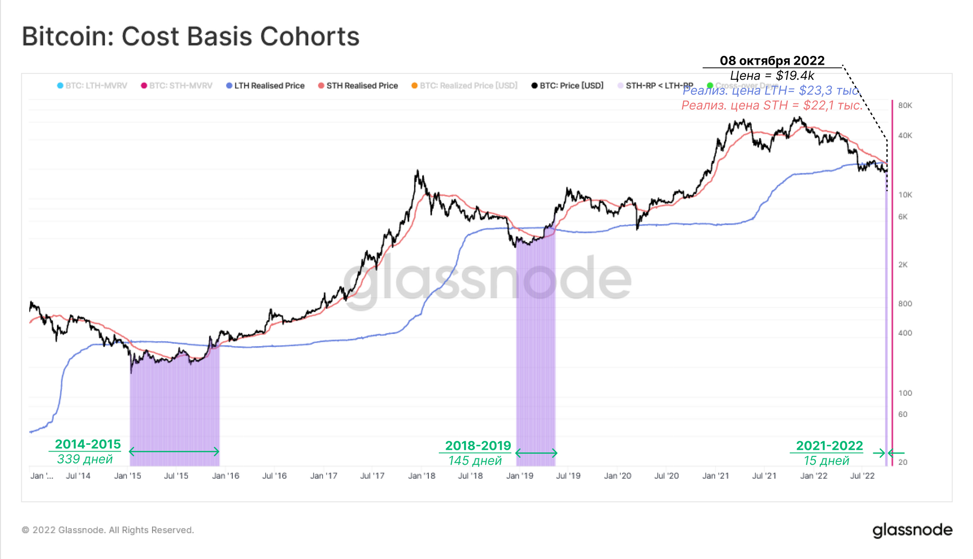 Две недели назад рынок вступил в эту стадию, и в сравнении с предыдущими медвежьими рынками, восстановление занимало от 145 до 339 дней. Учитывая, что базовая стоимость LTH составляет 23,3 тыс. долларов, а STHs - 22,1 тыс. долларов, это создает ключевую ценовую зону, где можно ожидать сопротивление, но также она создает потенциал для более благоприятных рыночных условий, если цены будут расти и останутся высокими.
