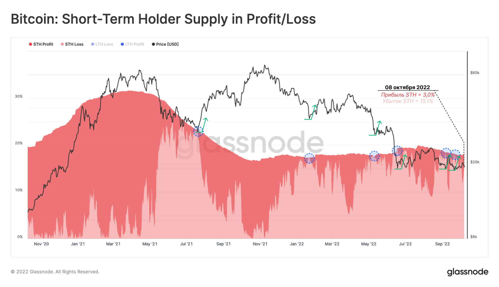 Рассматривая Предложение краткосрочных холдеров в прибыли/убытке, можно отметить множество случаев, когда ценовая коррекция приостанавливалась, поскольку все (>99%) предложение краткосрочных держателей приходилось на убыток 🔵.На данный момент 18,1% от общего объема предложения находится во владении STH, при этом 15,1% удерживается с нереализованным убытком. Таким образом, Краткосрочные холдеры удерживают всего 3% предложения в прибыли, которая после такого длительного нисходящего тренда, вероятно, приближается к уровню истощения продавцов.