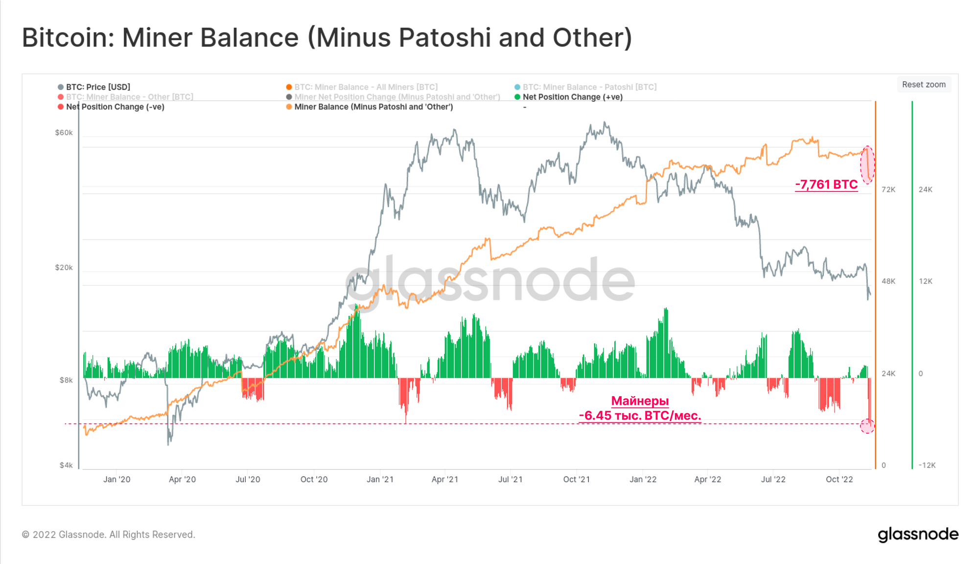Наконец, остается рассмотреть группу биткоин-майнеров, которые уже и так находятся в сложном положении и испытывают крайний стресс из-за недавнего снижения цен на монеты. Поскольку цены на хэш достигли рекордно низких значений, майнеры были вынуждены ликвидировать около 9,5% своих запасов на этой неделе, потратив 7,76 тыс. BTC. Это самое резкое ежемесячное снижение баланса майнеров с сентября 2018 года и демонстрирует проциклическую природу майнинга Биткоина.