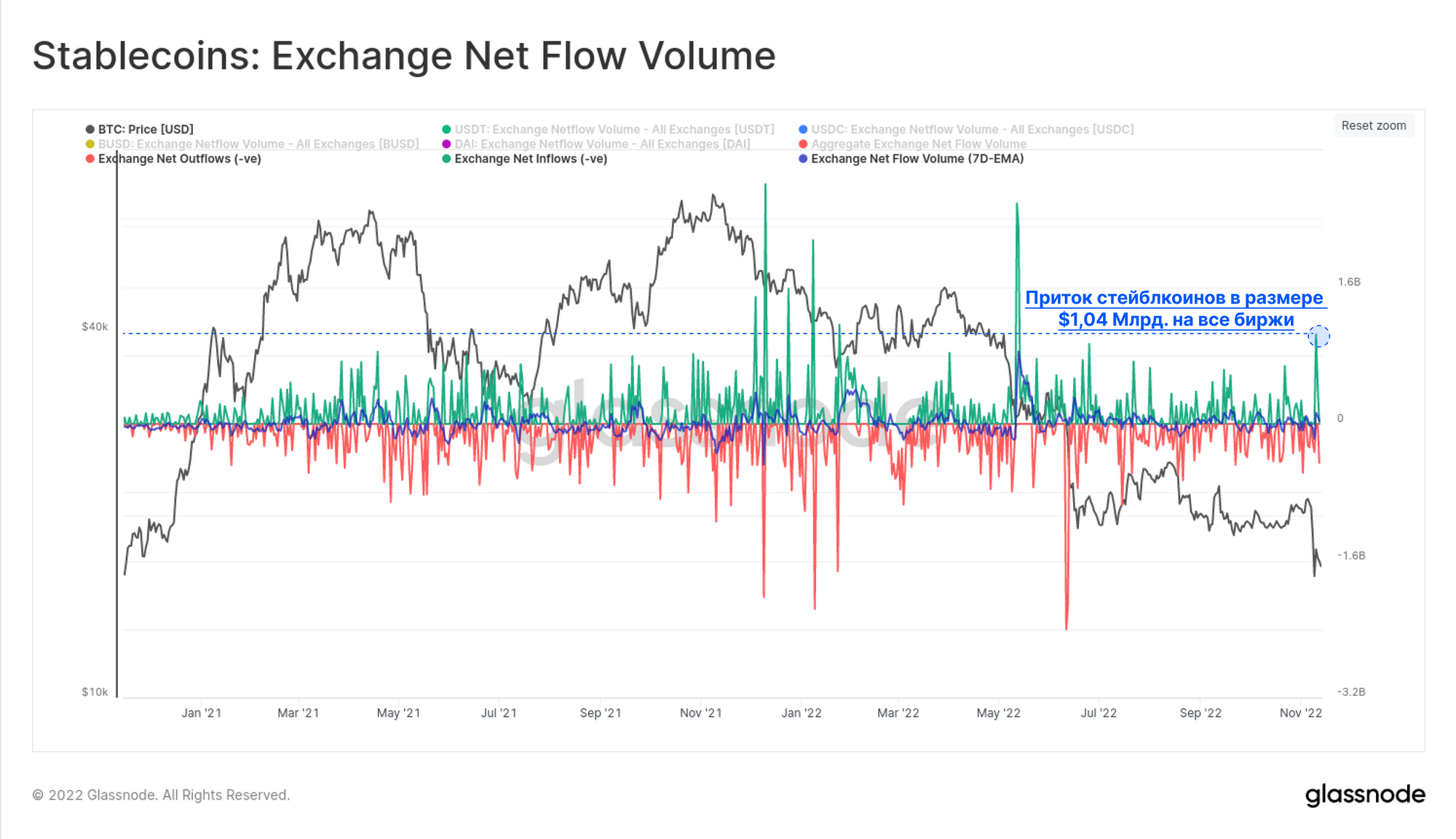 В то время как валютные резервы BTC и ETH сократились на этой неделе, стейблкоины в сети стали поступать на биржи, при этом 10 ноября поступило более $ 1,04 млрд в комбинированных USDT, USDC, BUSD и DAI, что является 7ым по величине случаем чистого притока за день в истории рынка.