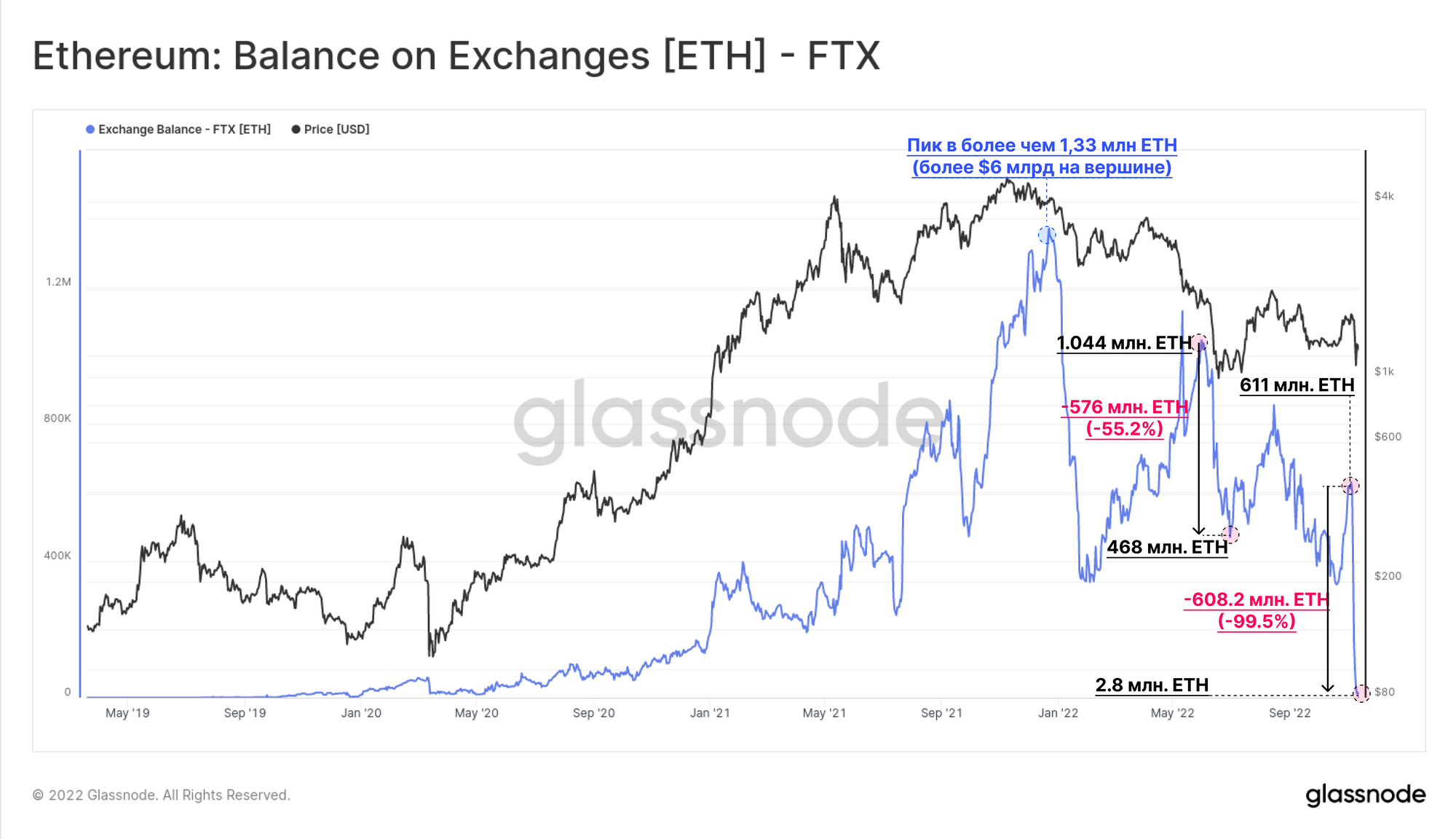 Как и Битокина, так и ETH практически не осталось на кошельках FTX, клиенты экстренно выводили средства, из-за чего оставшийся баланс биржи начал стремительно снижаться.