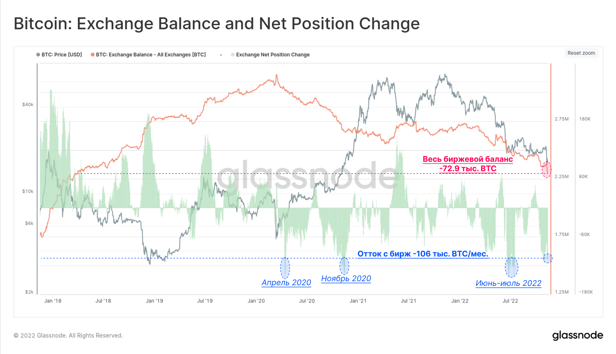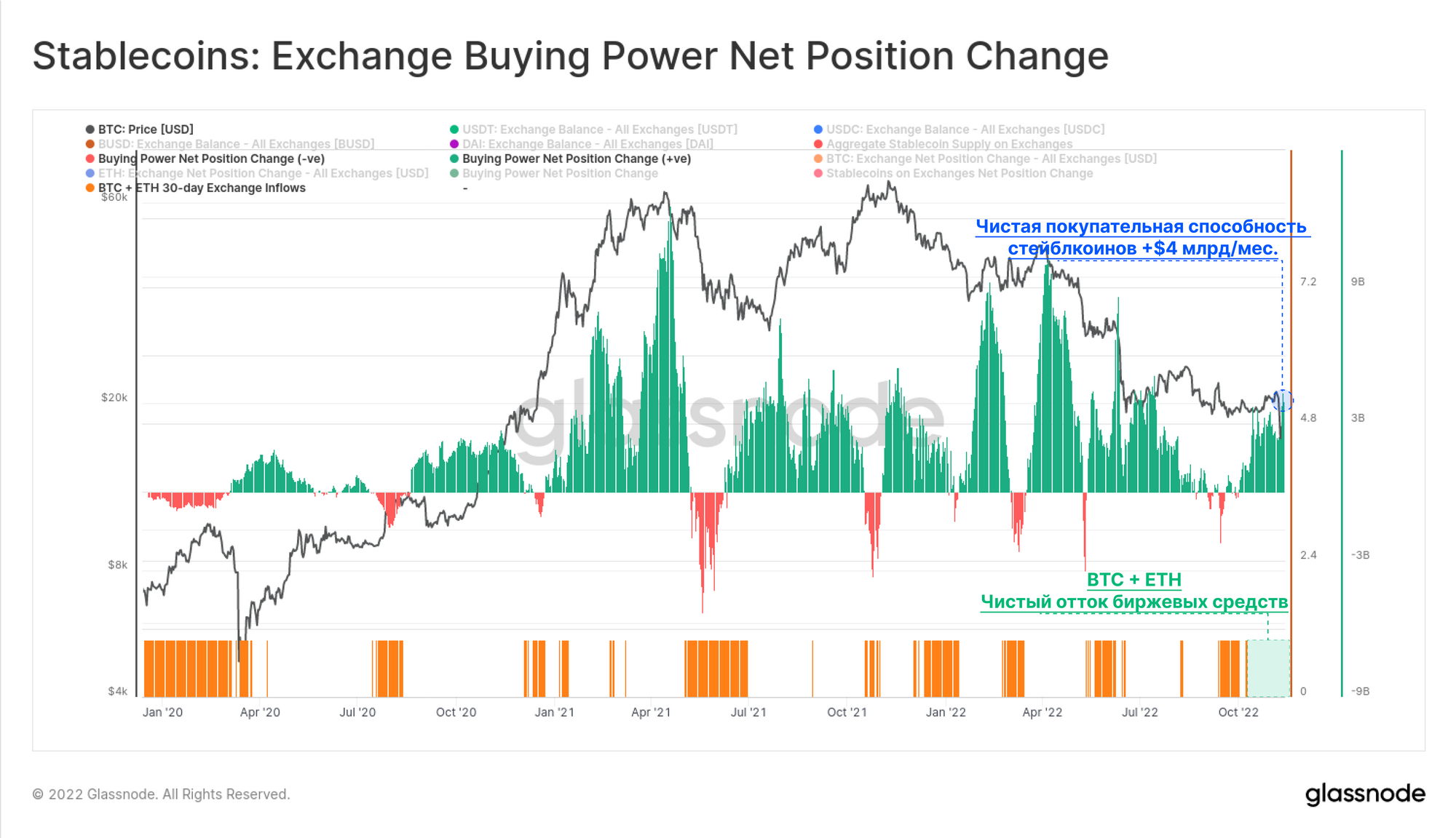 - Отсутствие 🟧 в трассировке штрих-кода (заштрихованный участок) указывает на то, что на биржах наблюдается чистый отток BTC + ETH.