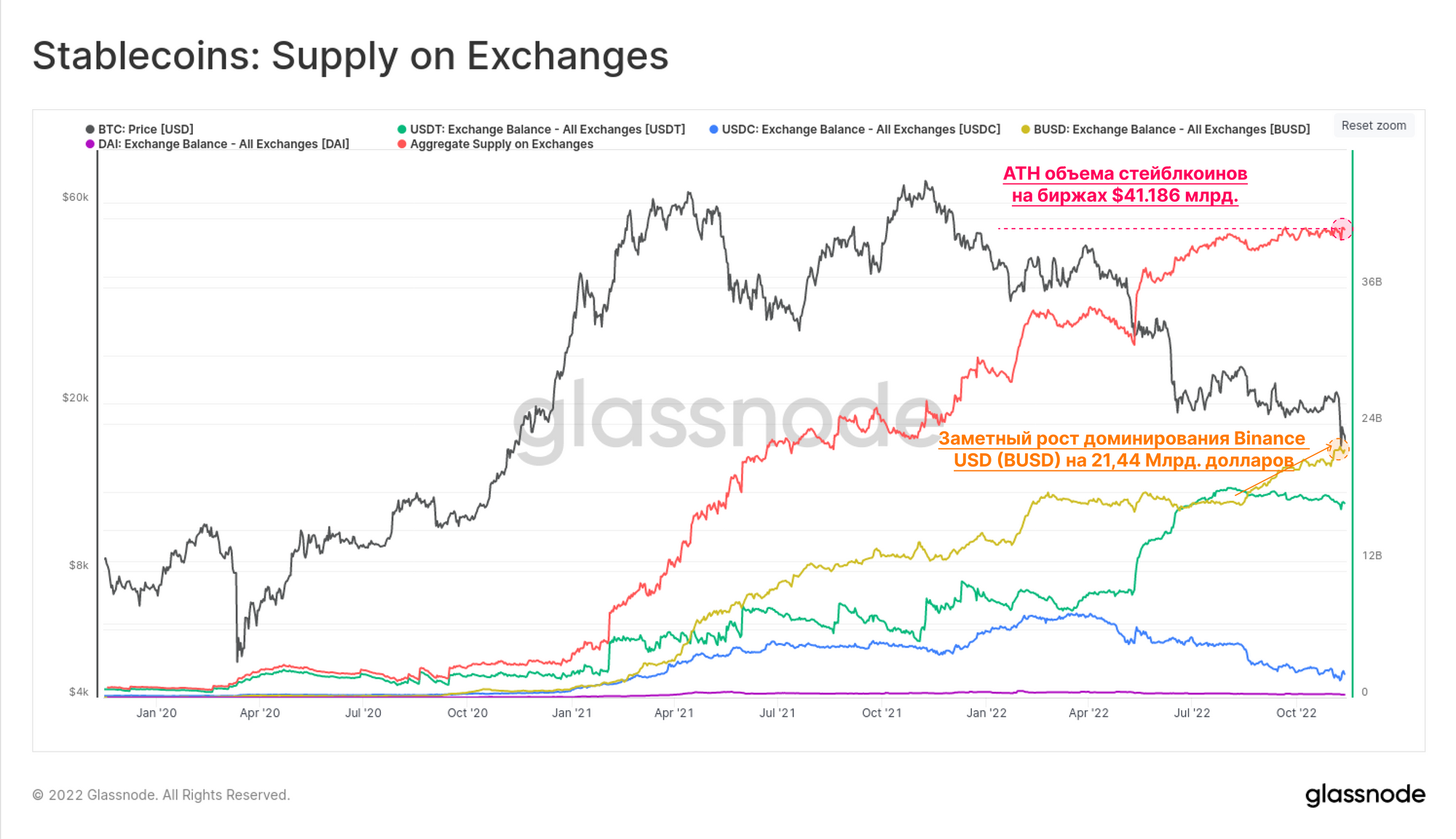 Это привело к тому, что стейблкоины, хранящиеся во всех резервах бирж, достигли нового рекордного уровня в $41,186 млрд. Мы также можем наблюдать заметный рост доминирования BUSD: в валютных резервах хранится более 21,44 миллиарда долларов. Вероятно, это результат недавней консолидации стабильных монет Binance в BUSD, а также ее растущего доминирования в качестве крупнейшей биржи в мире.