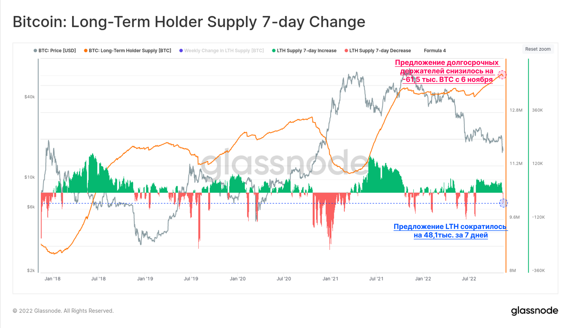 Предложение долгосрочных холдеров, которое, по статистике, с наименьшей вероятностью будет потрачено, сократилось на 61,5 тыс. BTC с 6 ноября. За последние 7 дней было потрачено примерно 48,1 тыс. BTC, что, безусловно, свидетельствует о нетривиальности события. Однако, учитывая масштабы изменения баланса, подробно описанные выше, в сравнении с историческими прецедентами,еще не представляется возможным сделать вывод о повсеместной потере уверенности. Однако, если текущая ситуация перерастет в устойчивое сокращение предложения LTH, это может свидетельствовать об обратном.