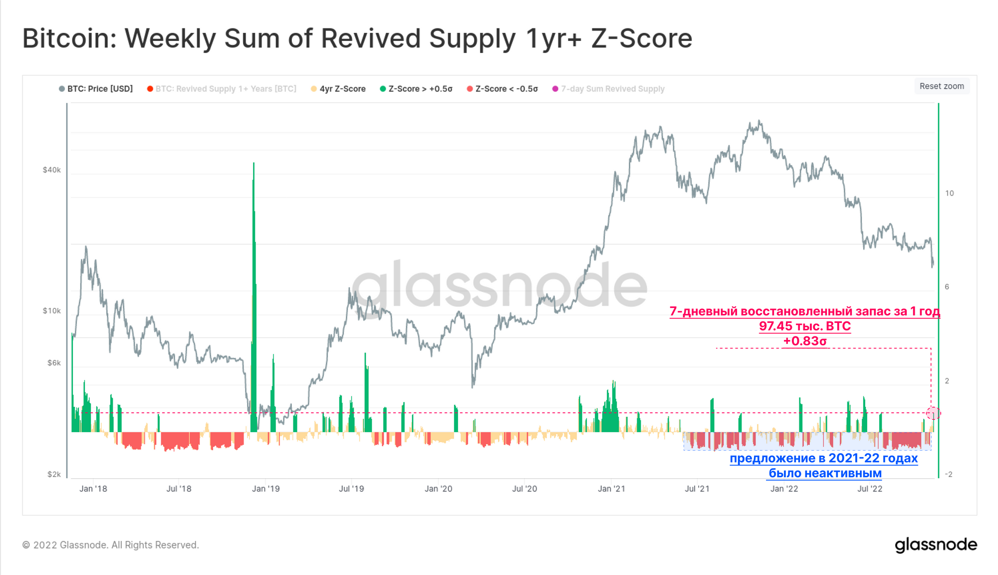 На приведенном ниже графике представлен показатель Z-Score недельной суммы Возобновленного предложения старше 1 года (за 4 года). За последнюю неделю было потрачено 97,45 тыс. BTC, которые были старше 1 года, и вероятно возвращены в циркулирующаю ликвидности.