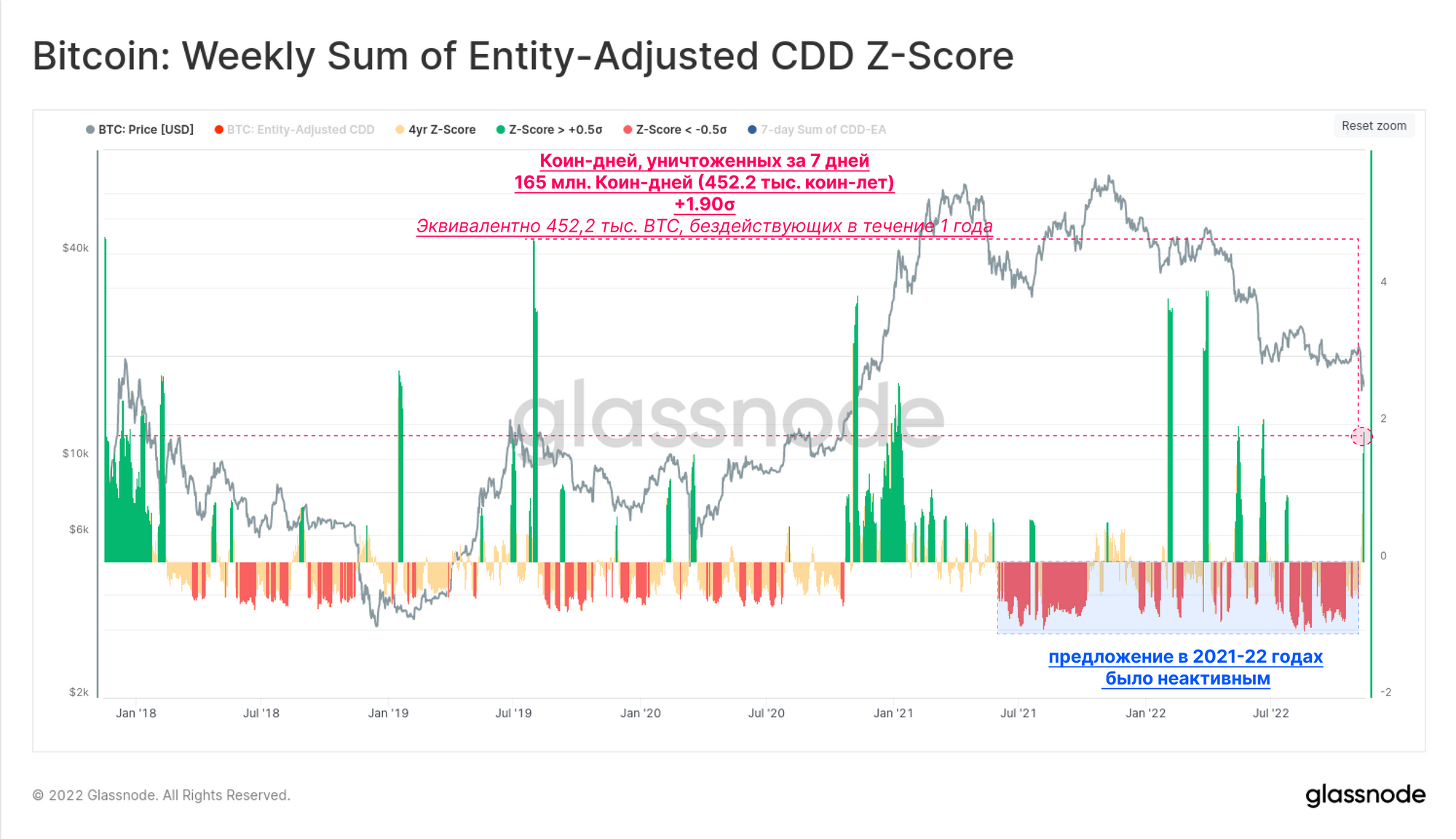 Наконец, мы можем вновь рассмотреть показатель Z-Score за 4 года, но на этот раз для анализа суммы уничтоженных дней коин-дней за неделю (CDD). Здесь мы можем увидеть, что после длительного периода крайне бездействующего предложения монет объем уничтожения монет на этой неделе достиг +1,9 стандартных отклонений выше среднего значения. На этой неделе было уничтожено в общей сложности 165 млн коин-дней, что эквивалентно расходованию 452,2 тыс. BTC, которые хранились в течение 1 года.