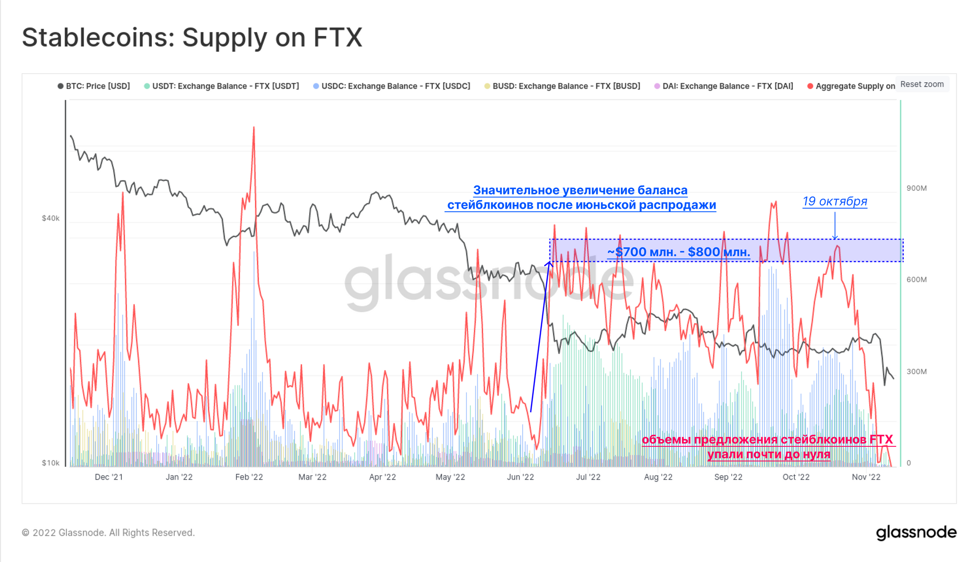 Если посмотреть на резервы стейблкоинов, мы можем увидеть, что совокупные резервы FTX начали значительно снижаться с 19 октября, упав с $ 725 млн фактически до нуля в течение следующего месяца.