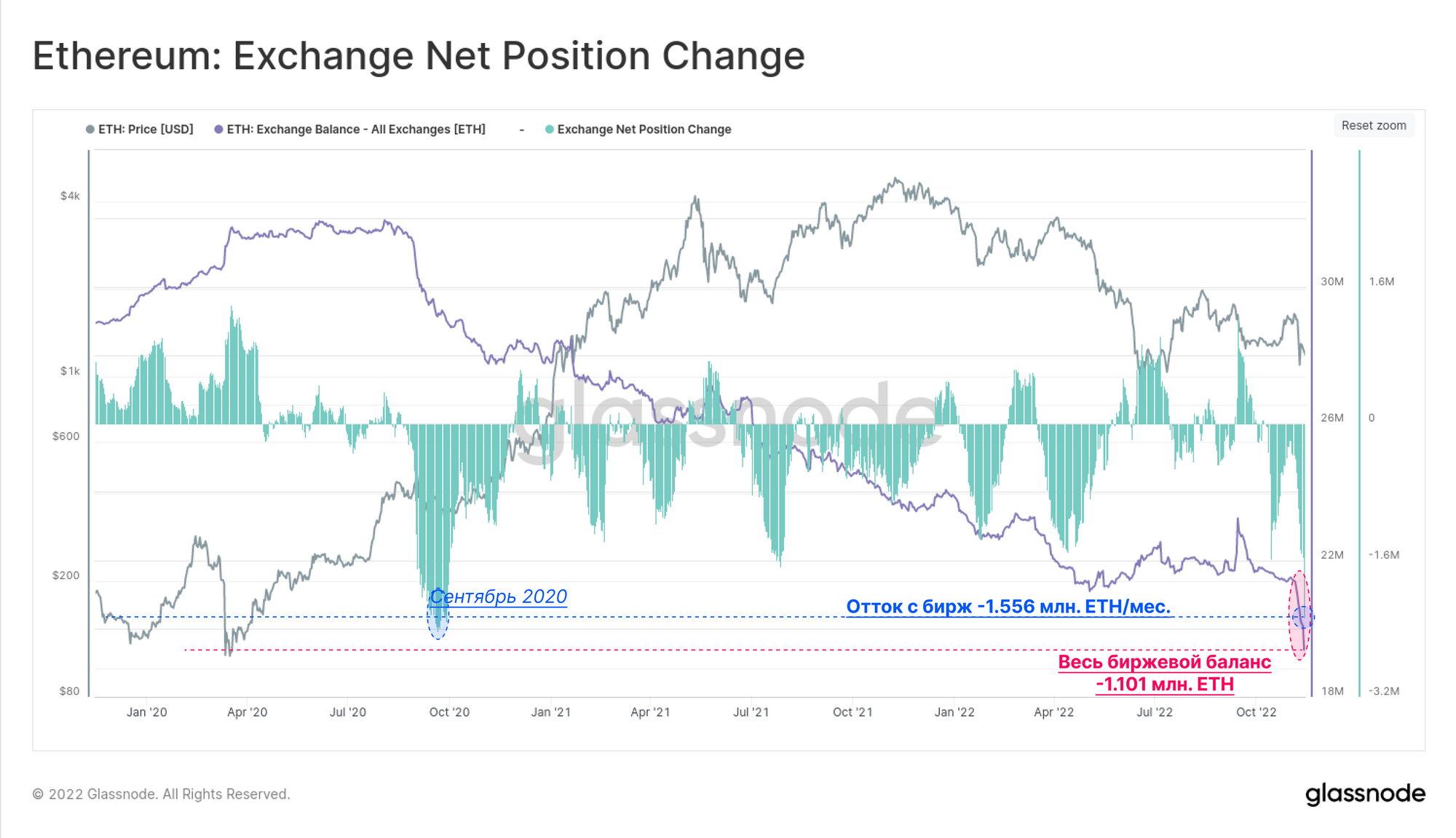- В июне, когда резервы сократились на 576 тыс. ETH (-55,2%)