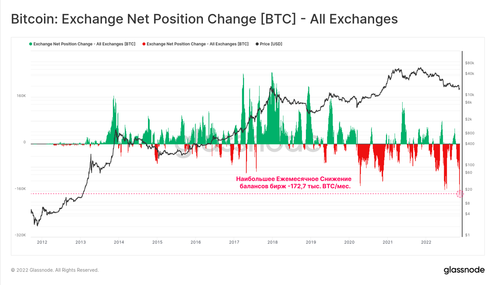 В настоящее время BTC выводится с бирж со скоростью 172,7 тыс. BTC в месяц, что превышает предыдущий пик, установленный после распродажи в июне 2022 года.