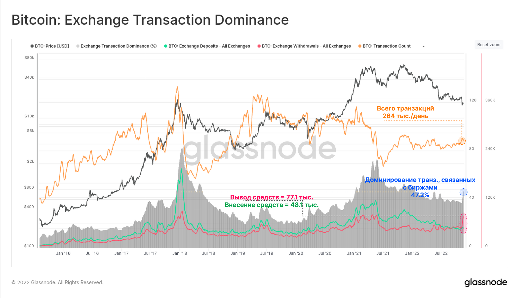 Этот всплеск активности, связанной с биржами, приводит к тому, что доля операций по внесению депозитов или выводу средств с бирж достигает 47,4% от общего объема, что является самым высоким показателем с начала года. Исторически сложилось так, что более высокое доминирование бирж может быть связано с бычьими рынками (устойчивые тенденции) и распродажами при высокой волатильности (краткосрочные всплески).