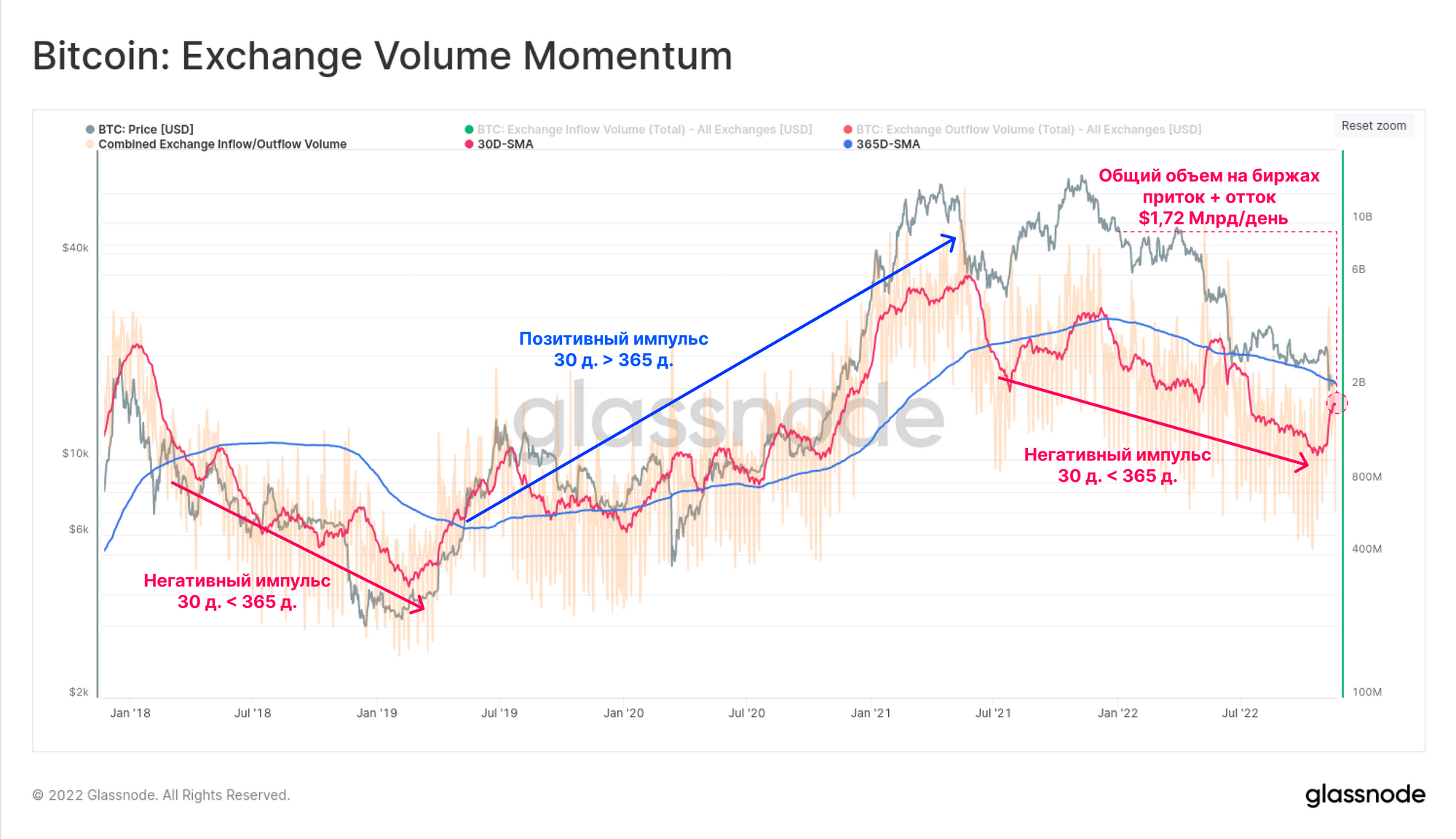 На основе 30-дневной скользящей средней совокупные объемы притока и оттока в долларах США на всех биржах выросли, достигнув на этой неделе 1,72 млрд долларов в день. На приведенной ниже диаграмме представлено это среднемесячное значение 🔴 относительно среднегодового значения 🔵 в качестве показателя общего импульса экономики Биткоина.