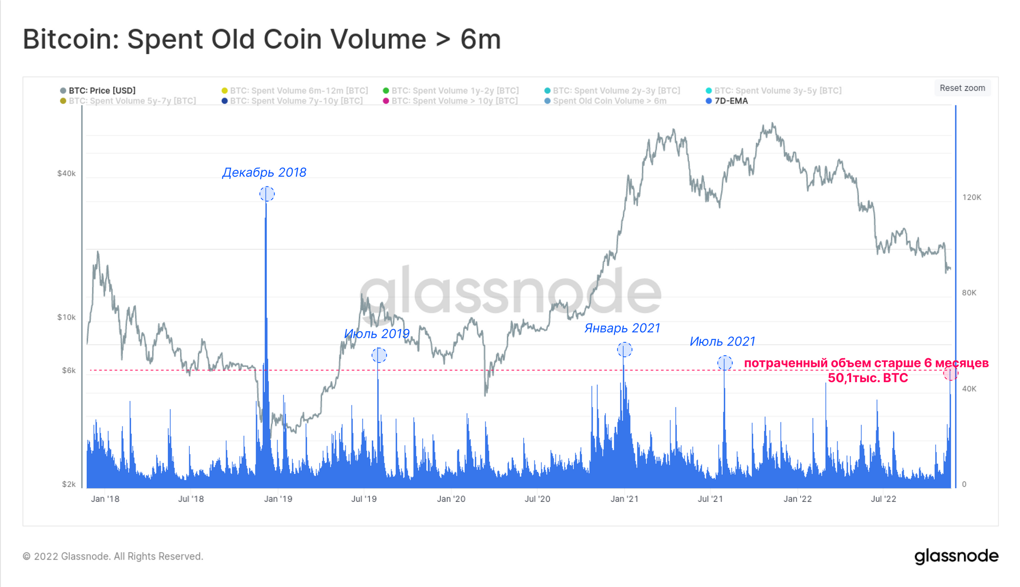 Объем потраченных BTC старше 6 месяцев также достиг пятого по величине значения за последние пять лет. Только 17 ноября было потрачено более 130,6 тыс. BTC старше 6 месяцев и более, при этом средний показатель за 7 дней сейчас составляет 50,1 тыс. BTC в день.