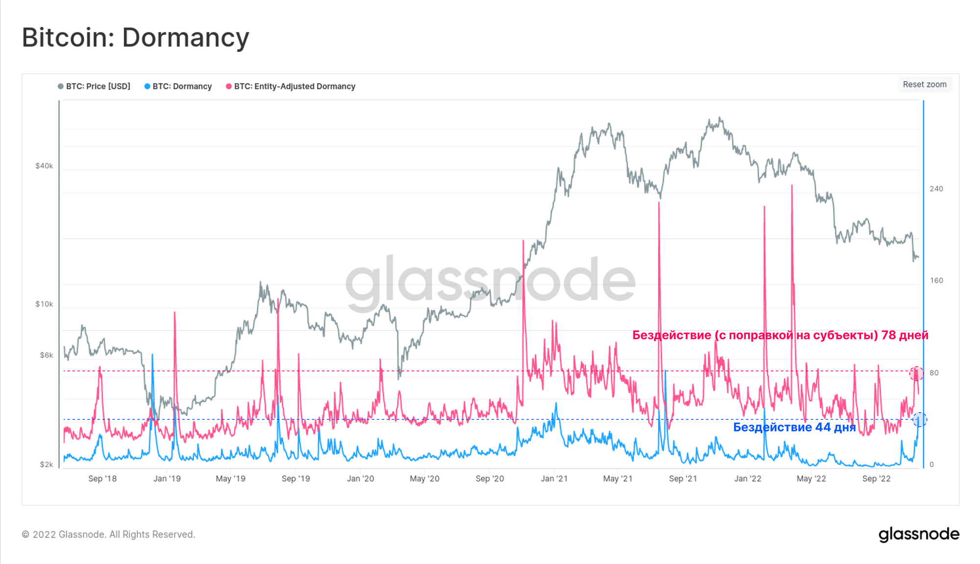 Средний возраст каждой потраченной монеты можно измерить с помощью показателя Бездействия, который также значительно вырос за последние недели. Ниже показаны две линии для разных вариантов показателя Бездействия:
