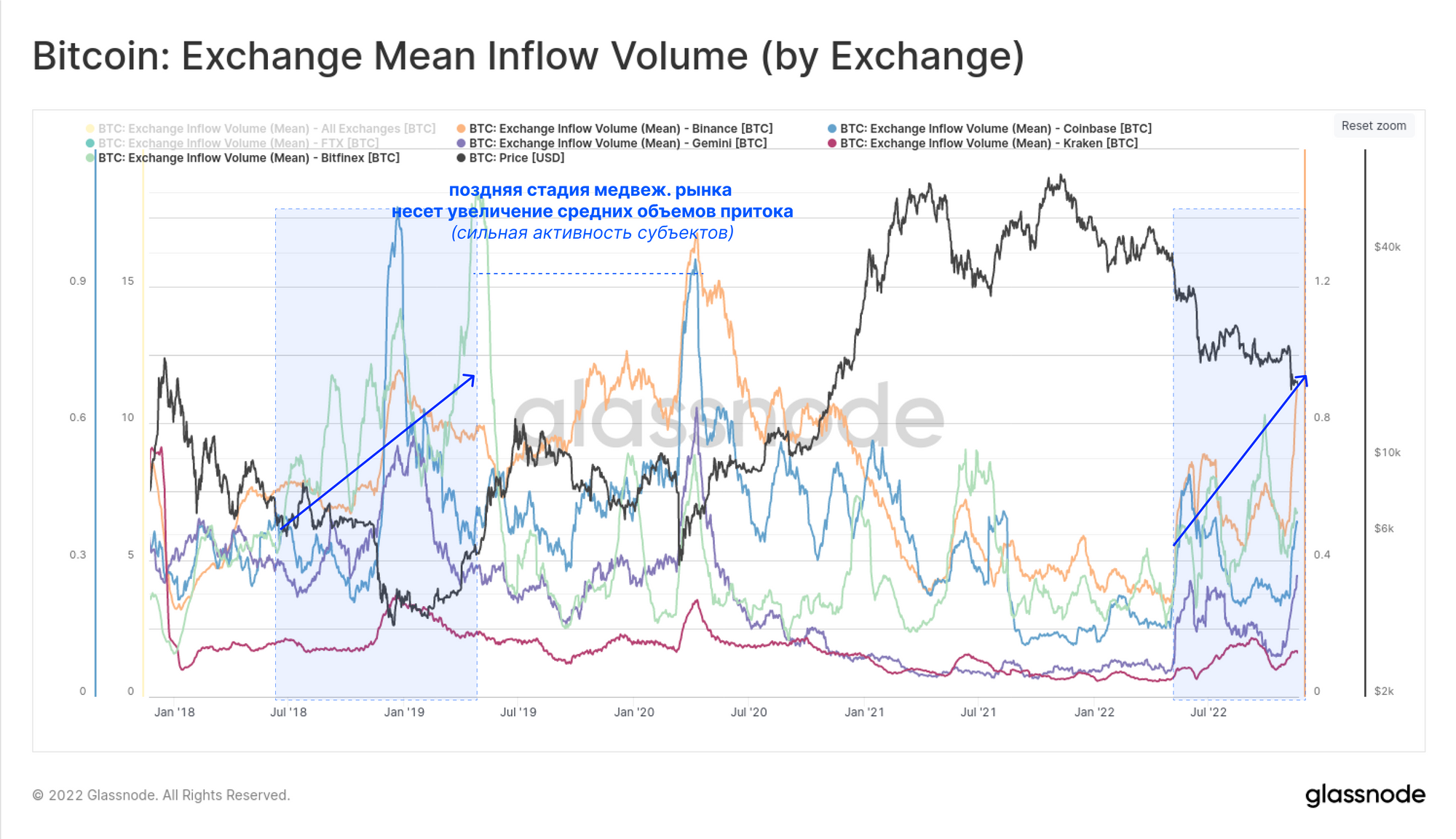 Тенденция, которую можно наблюдать на более поздних стадиях медвежьего рынка 2018-19 годов, заключается в совокупном увеличении Среднего объема притока на биржи. Другими словами, средний размер депозита в долларовом выражении на всех основных биржах увеличивается по мере того, как рынок формирует дно цикла. Это происходит на всех основных биржах, включая Binance, Bitfinex, Coinbase, Gemini и Kraken.