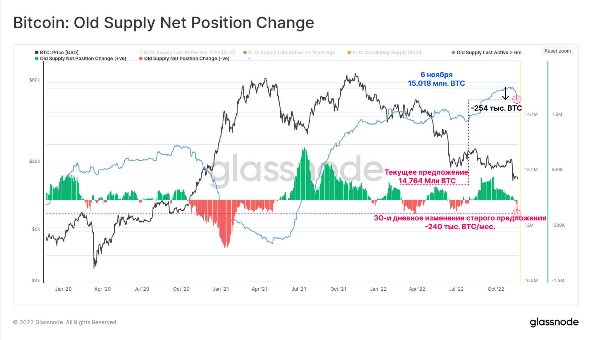 За время, прошедшее с момента краха FTX, было потрачено в общей сложности 254 тыс. BTC старше 6 месяцев, что эквивалентно примерно 1,3% от циркулирующего предложения. На основе 30-дневных изменений это самое резкое снижение предложения старых монет с января 2021 года, когда долгосрочные инвесторы фиксировали прибыль на бычьем рынке.