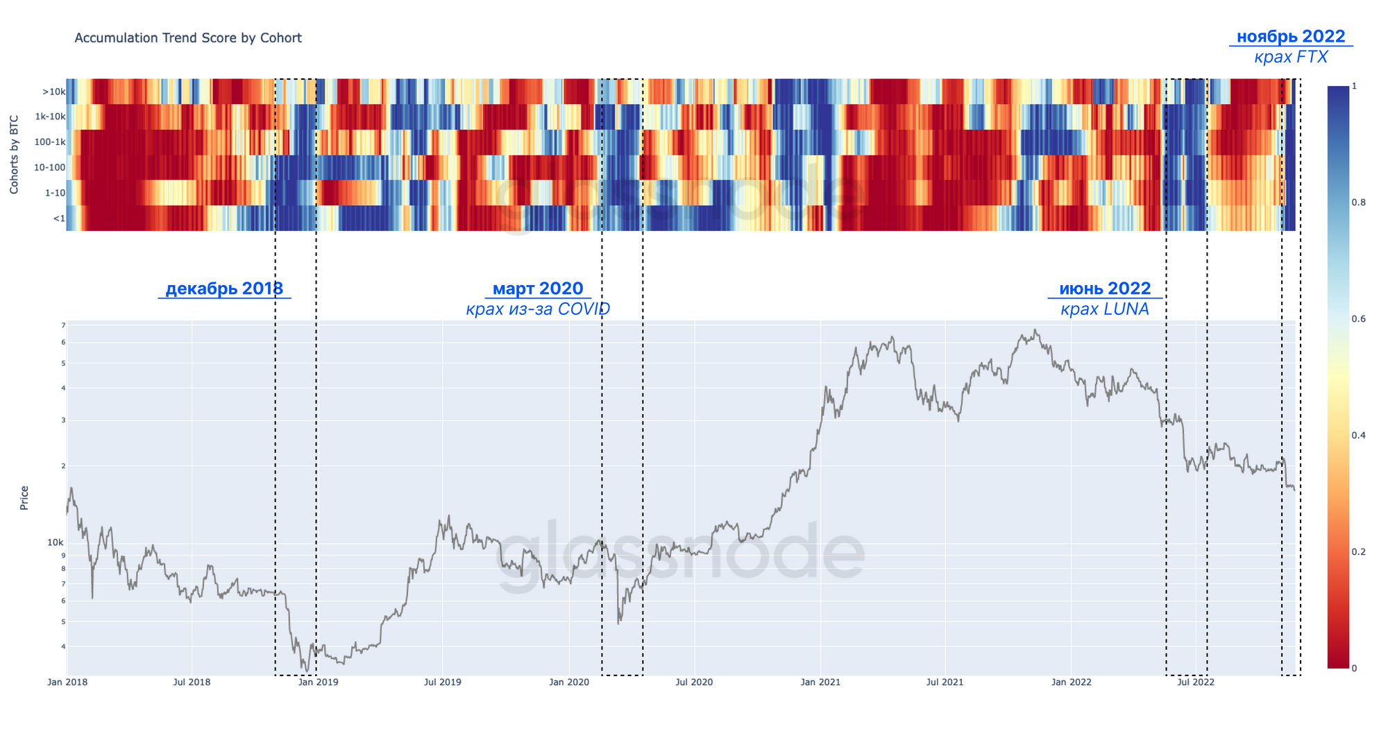 Учитывая такой хаотичный год, решимость Биткоин-холдеров была подвергнута невероятно серьезному испытанию в течение 2022 года. Настолько, что подобных примеров в истории рынка трудно найти. Те немногие аналогии, которые существуют в истории Биткойна, несмотря небольшие по размеру выборки, в ретроспективе оказались точками абсолютного истощения продавца.