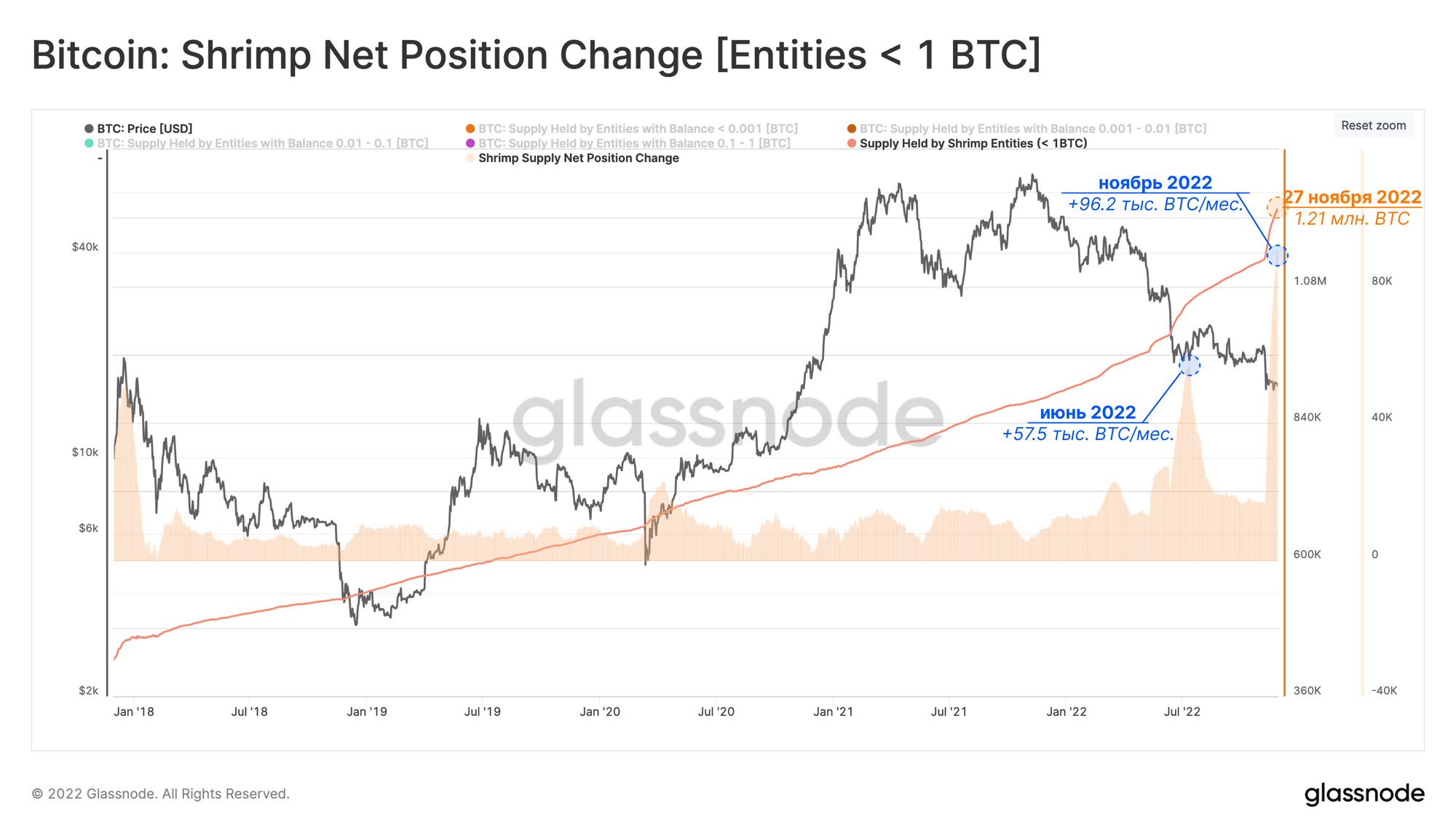 Среди всех когорт субъекты, владеющие < 1 BTC (также обозначенные как Креветки🦐 ), зафиксировали две характерные рекордно высокие волны увеличения баланса за последние 5 месяцев. Креветки увеличили свои запасы на 96,2 тыс. BTC с момента краха FTX и теперь владеют более чем 1,21 млн BTC, что эквивалентно 6,3% от оборотного предложения.