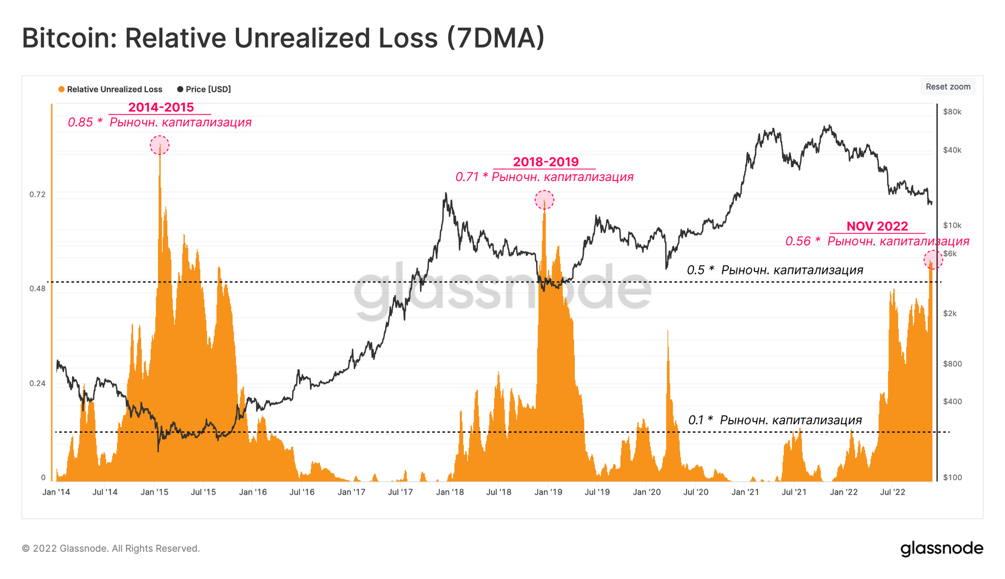 Отслеживание среднего значения этого индикатора за неделю показывает, что в крайних точках предыдущих медвежьих рынков инвесторы несли убытки, превышающие 50% от общей рыночной капитализации на тот период. Этот показатель недавно достиг максимума в 56%, что является самым высоким показателем за этот цикл и сопоставимо с предыдущими минимумами медвежьего рынка.