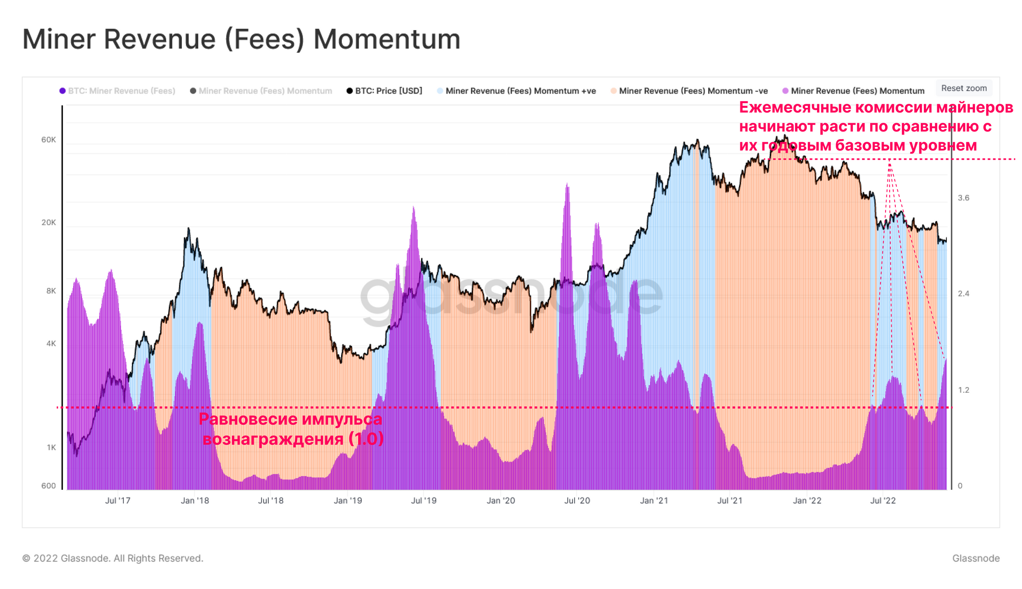 - Импульс комиссии выше 1 🔵 предполагает увеличение вклада майнеров в доход от сборов по сравнению с годовым базовым уровнем.