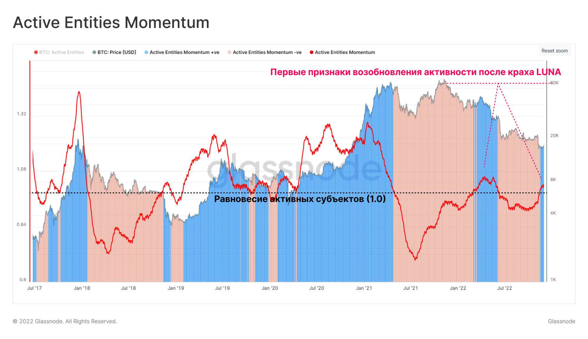 - Импульс выше 1 🔵 указывает на расширение активности уникальных субъектов.
