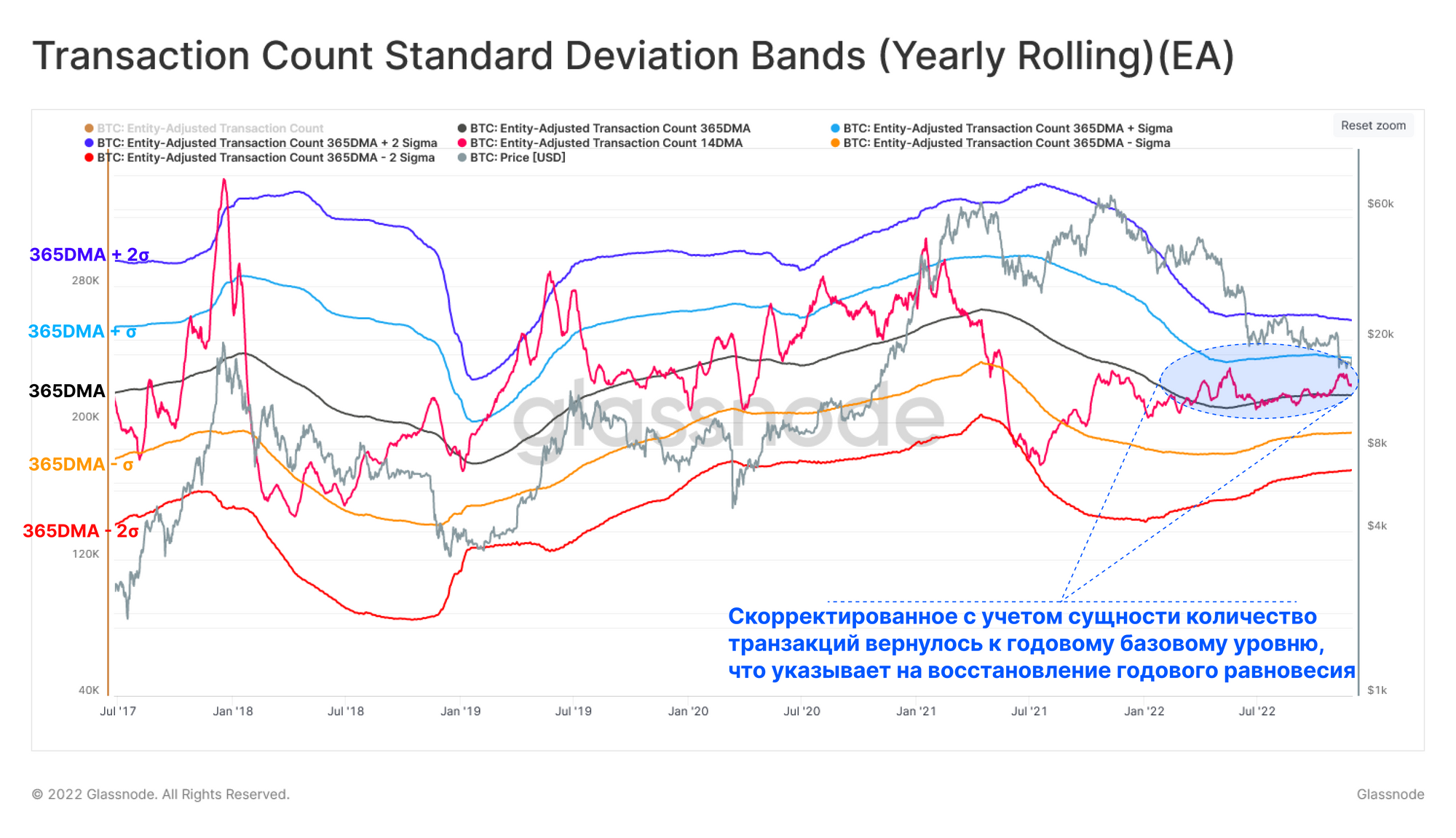 Далее мы вводим набор ежегодных скользящих диапазонов стандартных отклонений для показателя количества транзакций (с поправкой на субъекты). Это отображает 14-дневную простую среднюю для всех подтвержденных транзакций, а также ряд статистических полос в диапазоне ± 2σ.