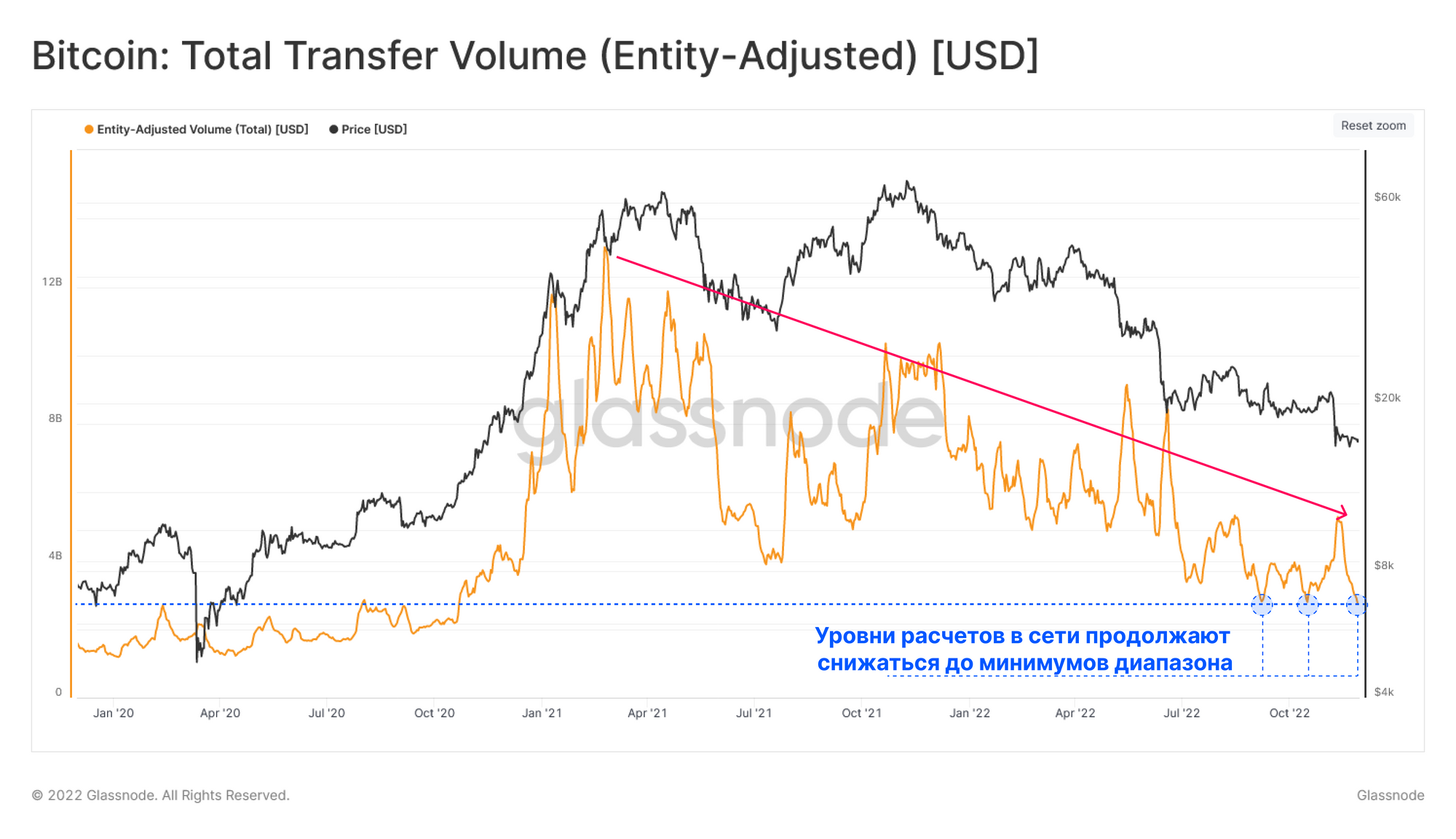 Есть некоторые структурные улучшения в сетевой активности Биткойна и спросе на пространство блоков. Однако эта тенденция остается в зачаточном состоянии, и ей не хватает последовательного роста объема переводов, который снова приближается к минимумам цикла.