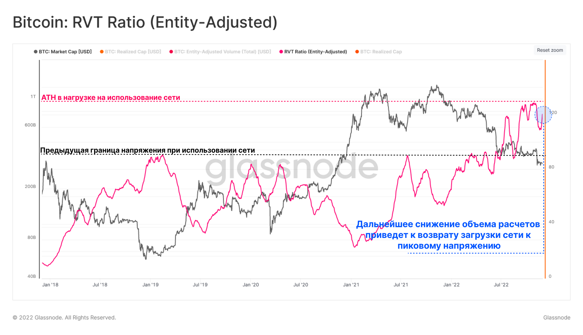 Это утверждение можно дополнительно подвергнуть критике, используя показатель RVT Ratiometric, который показывает, что сеть близка к пику недостаточного использования. Это говорит о том, что даже после значительного оттока капитала, описанного выше, реализованная капитализация Биткоина все еще относительно высока по сравнению с объемом переводов.
