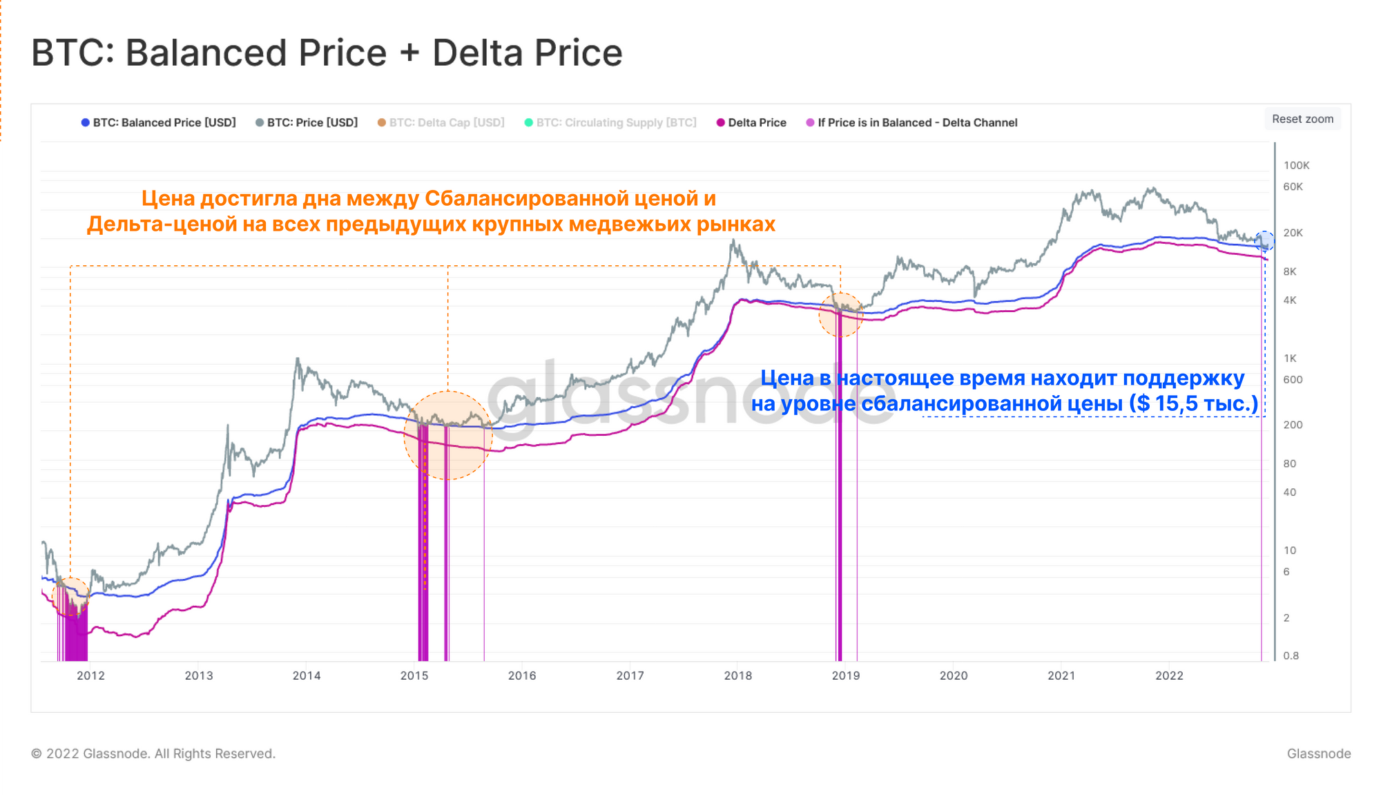- Сбалансированная цена 🔵 рассчитывается как разница между Реализованной ценой и Переводной ценой. Переводная цена- это совокупная сумма уничтоженных коин-дней в долларах США, скорректированная на оборотное предложение и общее время с момента создания Биткоина.