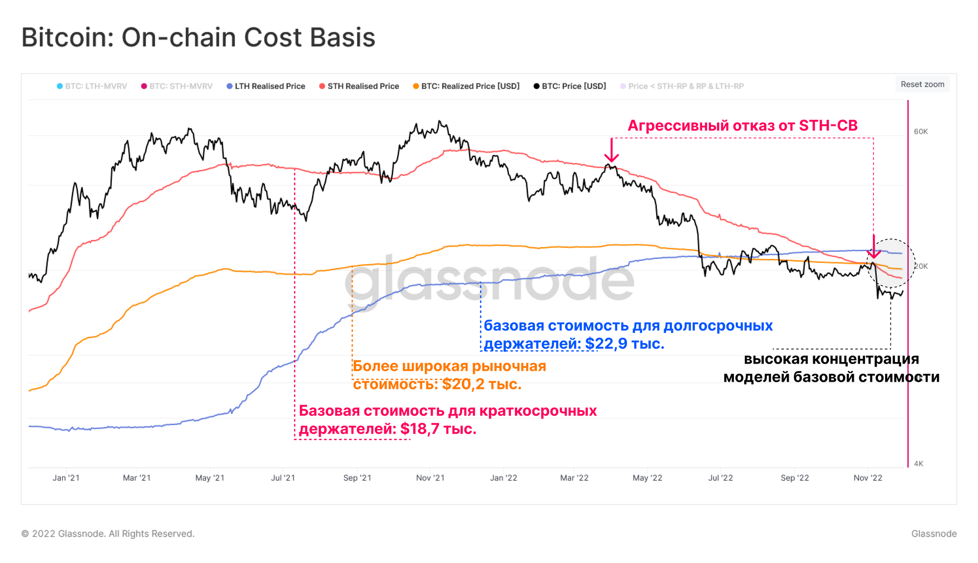 Базовая стоимость краткосроных холдеров (STH) в последнее время значительно снизилась, что свидетельствует о большом объеме монет, которые перешли из рук в руки в ноябре. Мы также можем отметить, что вся базовая стоимость в сети строго сосредоточена в диапазоне от 18,7 тыс. до 22,9 тыс. долл.