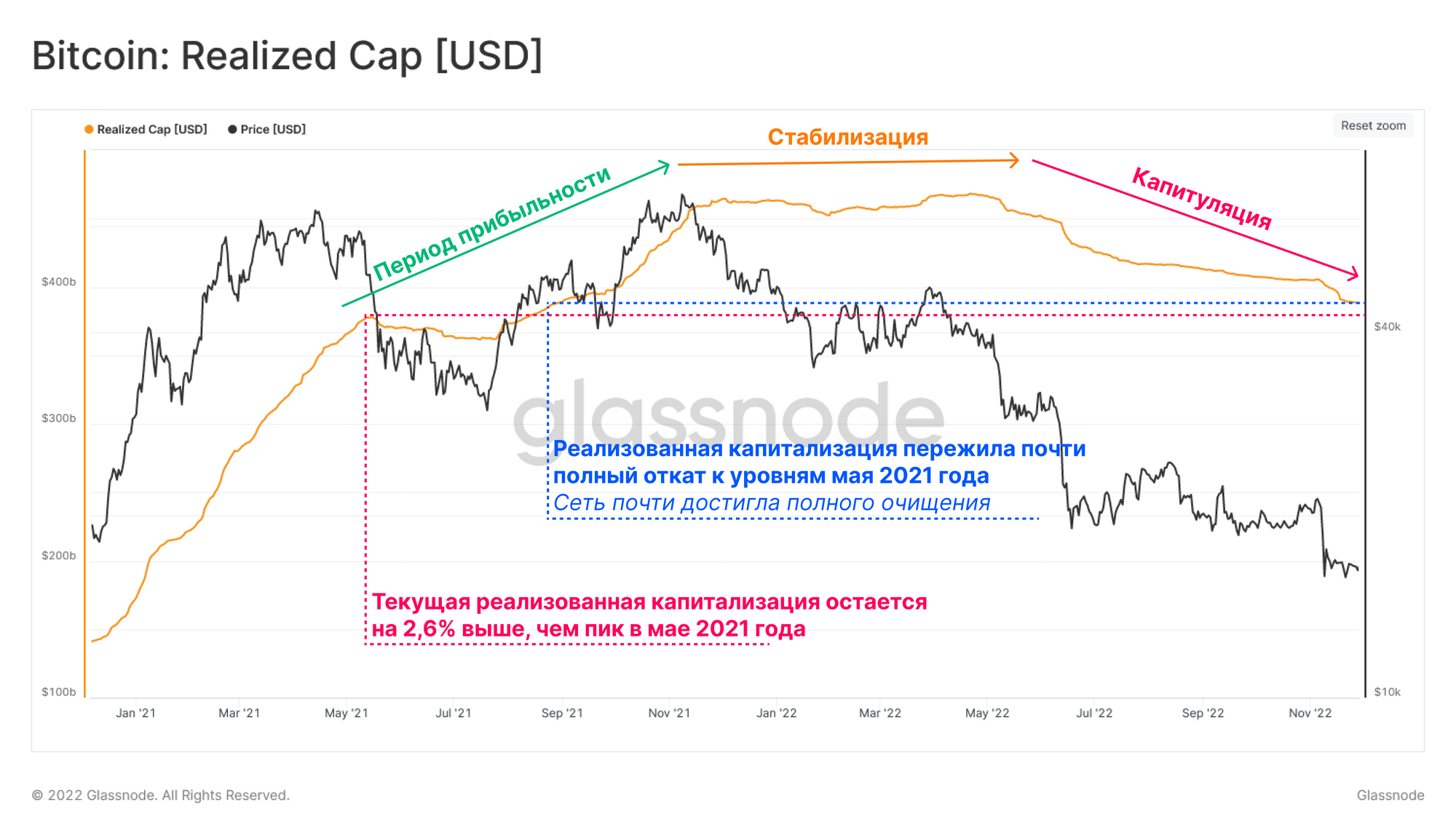 Реализованные убытки, понесенные биткойн-инвесторами за последние 6 месяцев, были историческими по своим масштабам. В последнее время стресс, связанный с низким уровнем прибыльности, начинает снижаться, но это приводит к полному выводу всей избыточной ликвидности, привлеченной за последние 18 месяцев. Это говорит о том, что в настоящее время произошло полное исключение спекулятивной премии 2021 года.