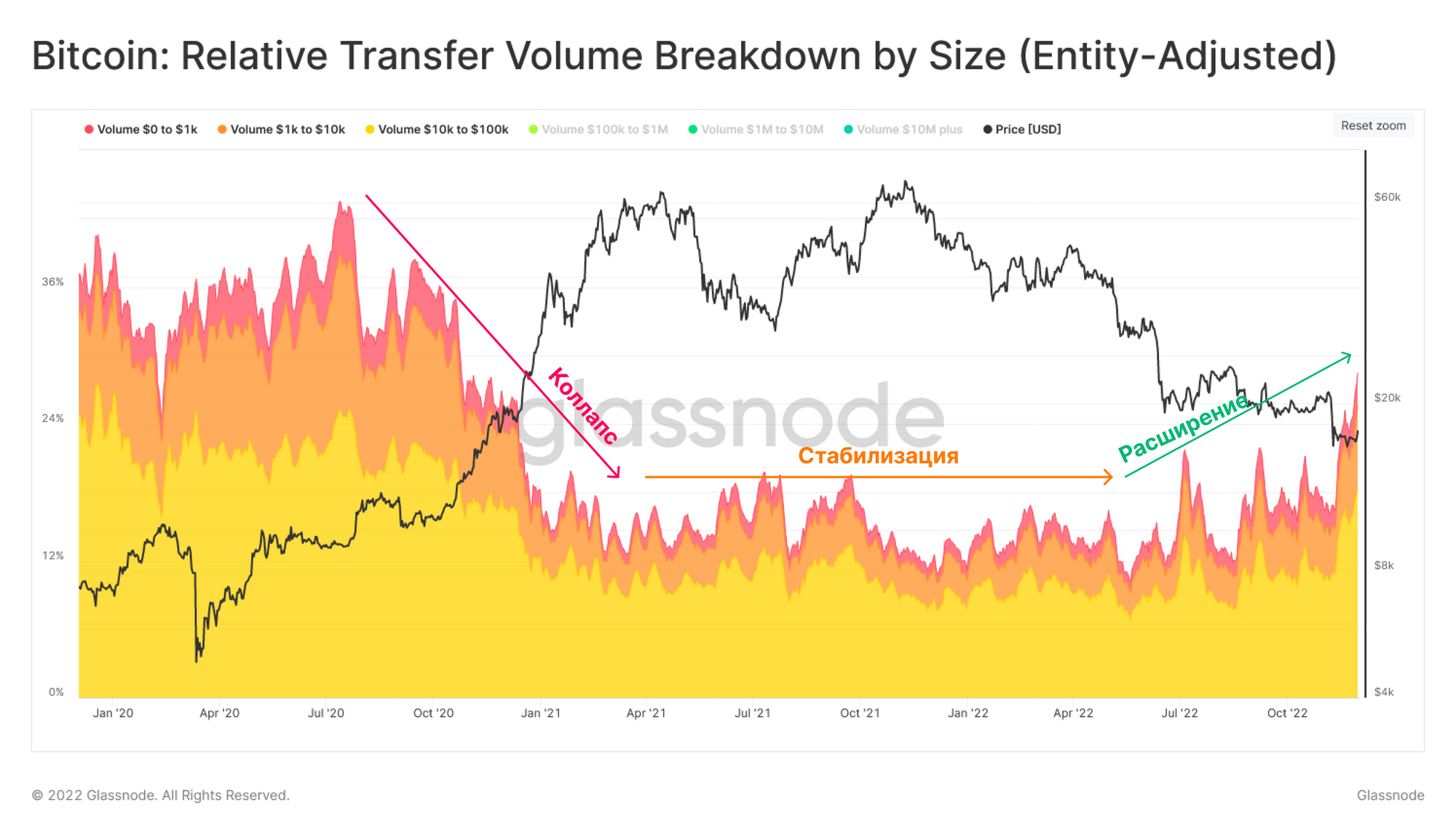 Поскольку количество транзакций восстанавливается, но объемы переводов снижаются, это, вероятно, является отражением более мелких переводов и снижения доминирования более крупных институциональных субъектов. Разбивка относительного объема переводов подтверждает это, показывая, что доминирование транзакций меньшего размера (до $ 100 тыс.) увеличилось примерно до 35%. Это разрыв с относительно стабильных 10% до 12% на протяжении всего цикла 2020-22 годов.