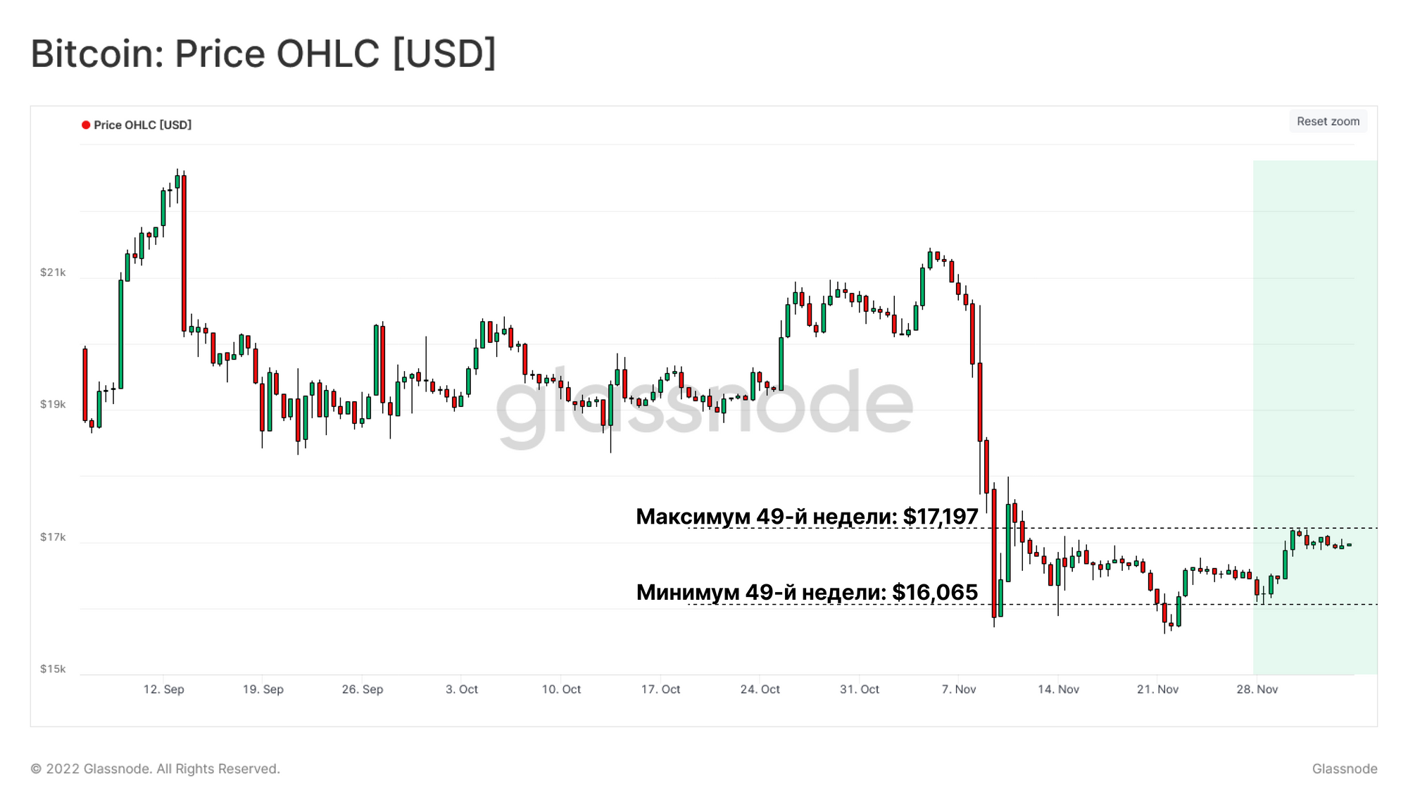 Рынок пережил значительную консолидацию выше циклических минимумов после нескольких бурных недель в результате краха FTX. Цена значительно восстановилась почти на 10%, отскочив от минимумов диапазона в 16 065 долларов до максимума в 17 197 долларов.