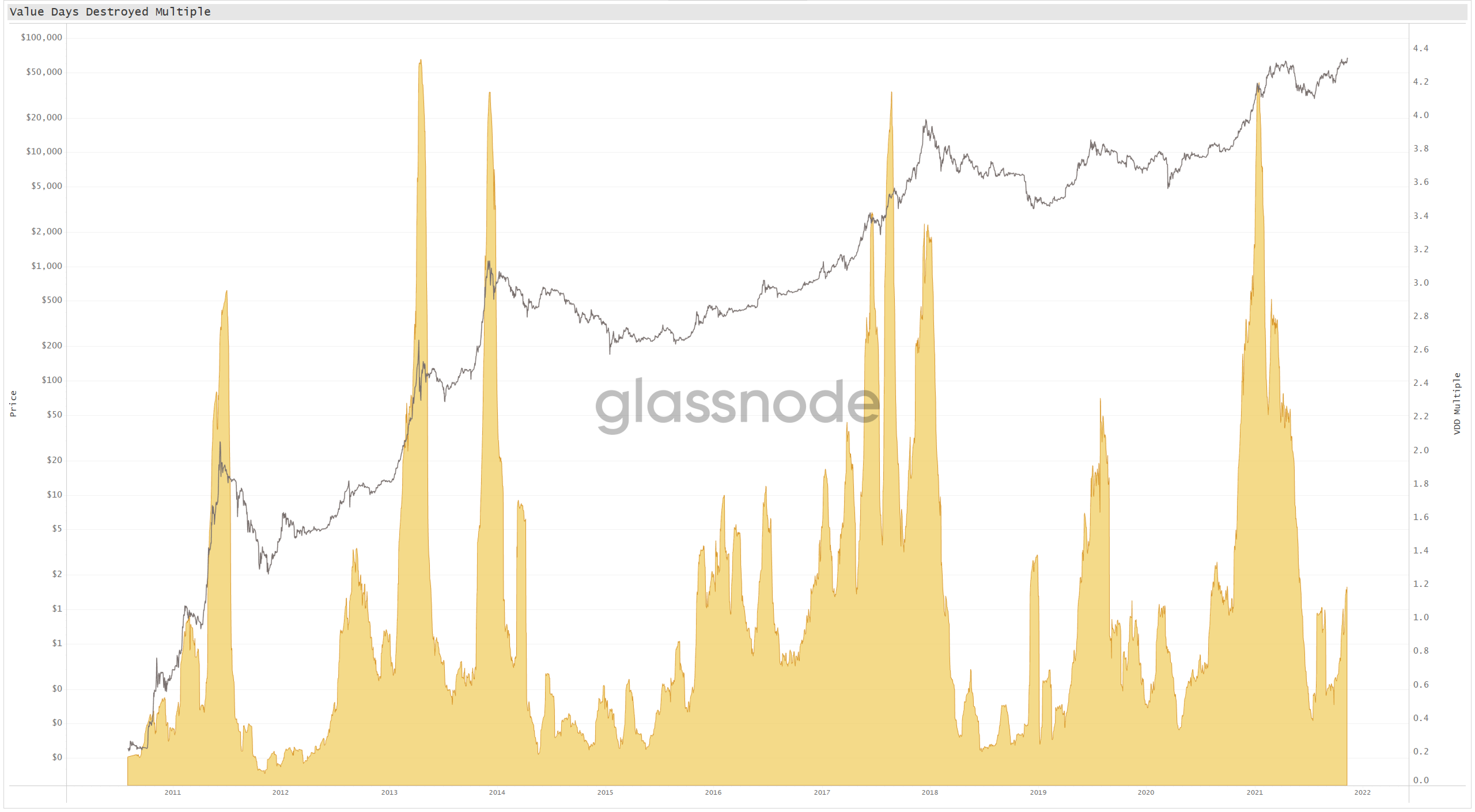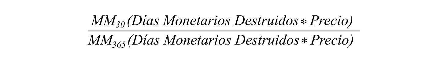 Para poder ajustar la actividad de gasto a las oscilaciones que presenta el precio a lo largo del tiempo, multiplicamos los DMD por el factor precio. Esto da lugar a una métrica que llamamos el Valor de los Días Destruidos (VDD), sinónimo de Valor de los Días Monetarios Destruidos, inicialmente introducida por Hans Hauge. Así alineamos los volúmenes que se gastan con sus respectivas valorizaciones y conformamos la base de nuestro nuevo barómetro de actividad.