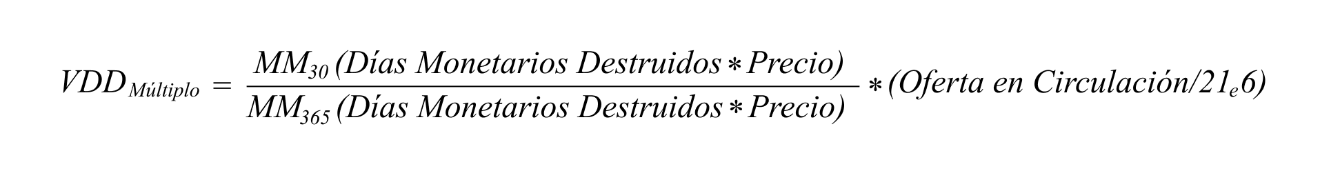 Mientras que por un lado el Múltiplo Puell compara la suma de los ingresos de un sólo día con lo generado el año anterior, nosotros vamos usar la media de 30 días del VDD como nuestra métrica a corto plazo. La fórmula es: