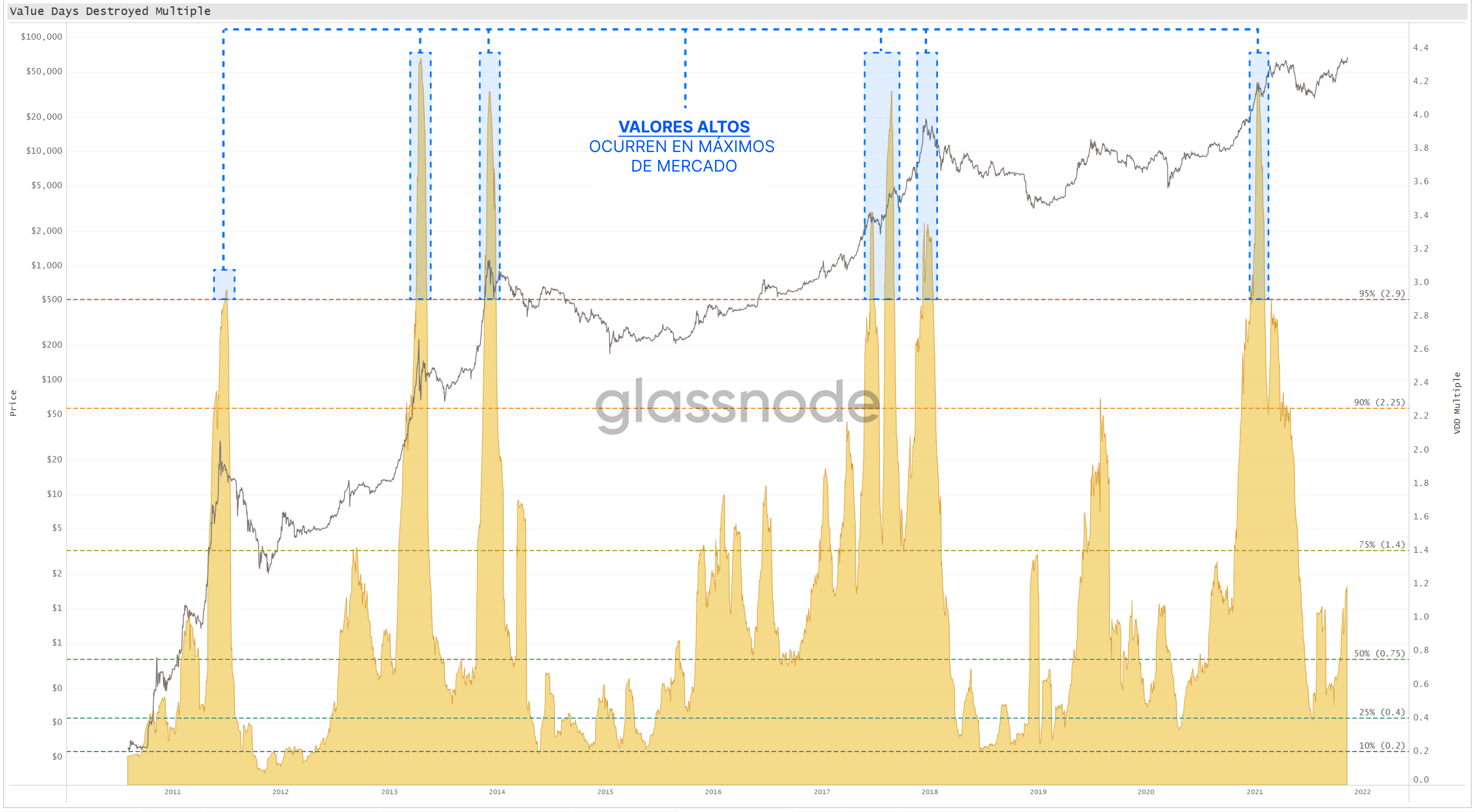 Como ejemplo, la línea superior señala un Múltiplo VDD de 2,9, que en el histograma aparece con un 95%. Esto quiere decir que el 95% de su historia Bitcoin ha permanecido por debajo de un valor del Múltiplo VDD de 2,9. Por tanto, sólo el 5% de días Bitcoin ha impreso valores por encima del 2,9. Estas líneas nos ayudan a interpretar si el mercado se está “sobrecalentando” en base a la velocidad de gasto.
