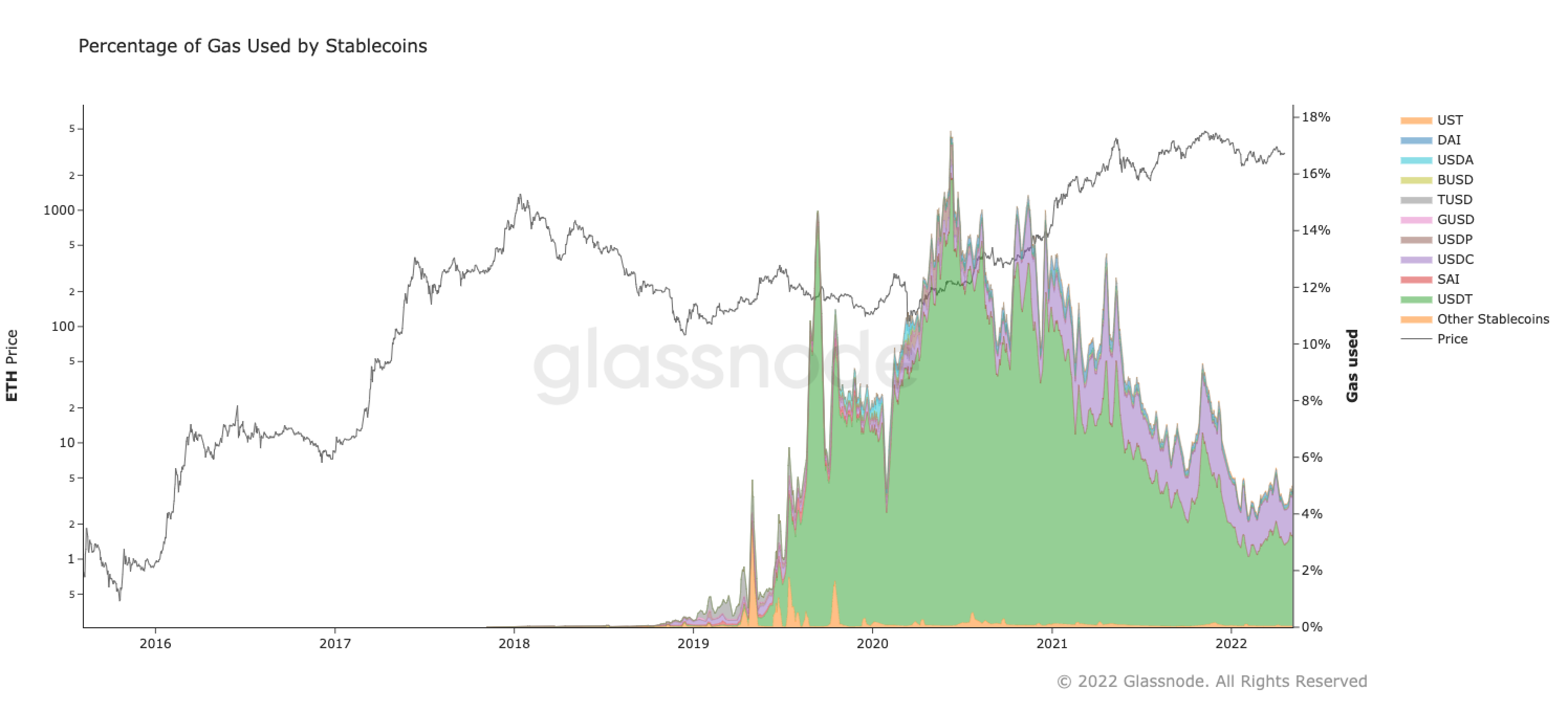 - Hay que tener presente que una bajada en el precio del gas puede ocurrir al tiempo que se produce más gasto fiat o en términos de Ether, y al contrario - para estar al tanto tendrías que dirigirte a la métrica correspondiente al valor absoluto en comisiones de Glassnode Studio. En este artículo sólo nos vamos a centrar en la cuota de cada actividad dentro del mercado del gas, lo que queremos es comparar el grado de prevalencia de cada tipo de utilización dentro del ecosistema de Ethereum.