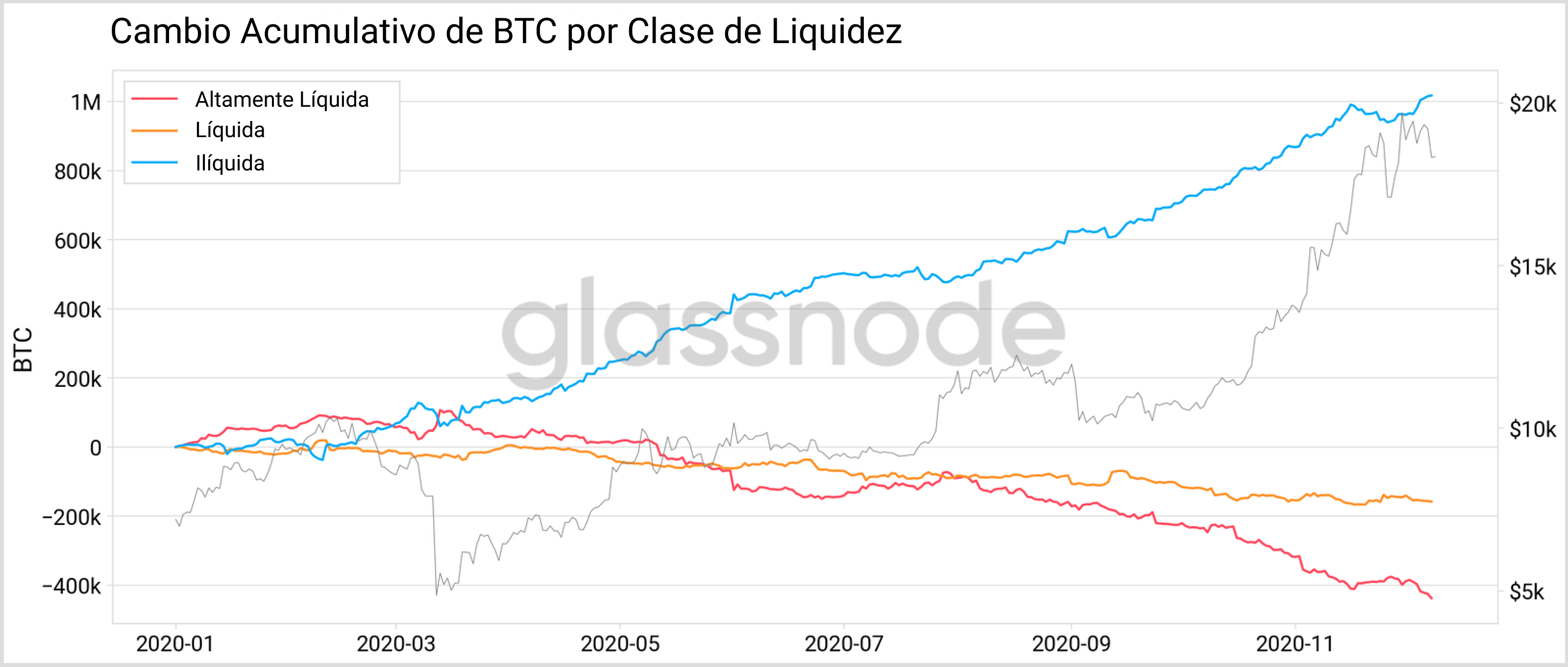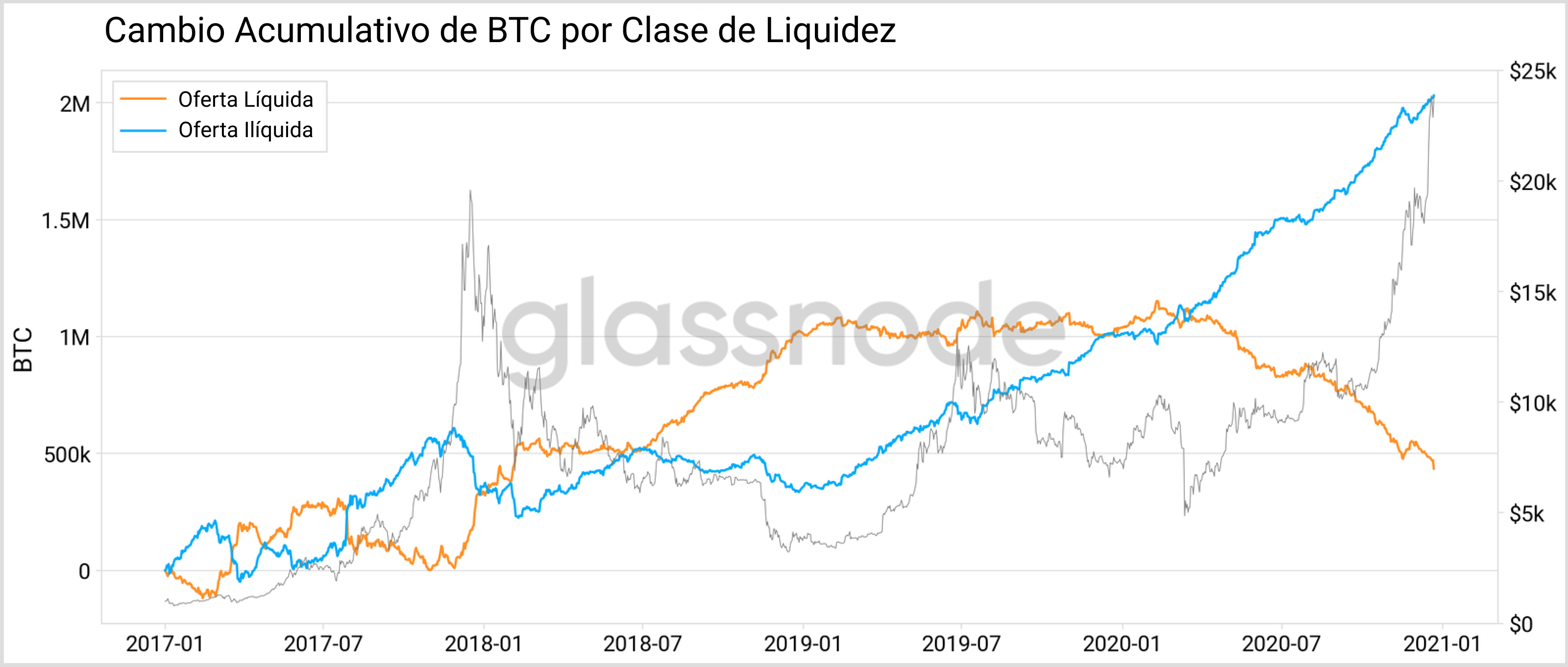 Merece la pena conocer cómo esta tendencia ha ido evolucionando. Al fijarnos en los cambios de oferta de cada categoría desde comienzos del 2020, vemos que se puso en marcha una clara tendencia ascendente en el grado de iliquidez de Bitcoin. Quiere decir que el último mercado alcista se desencadenó precisamente por un grado de iliquidez extraordinario.