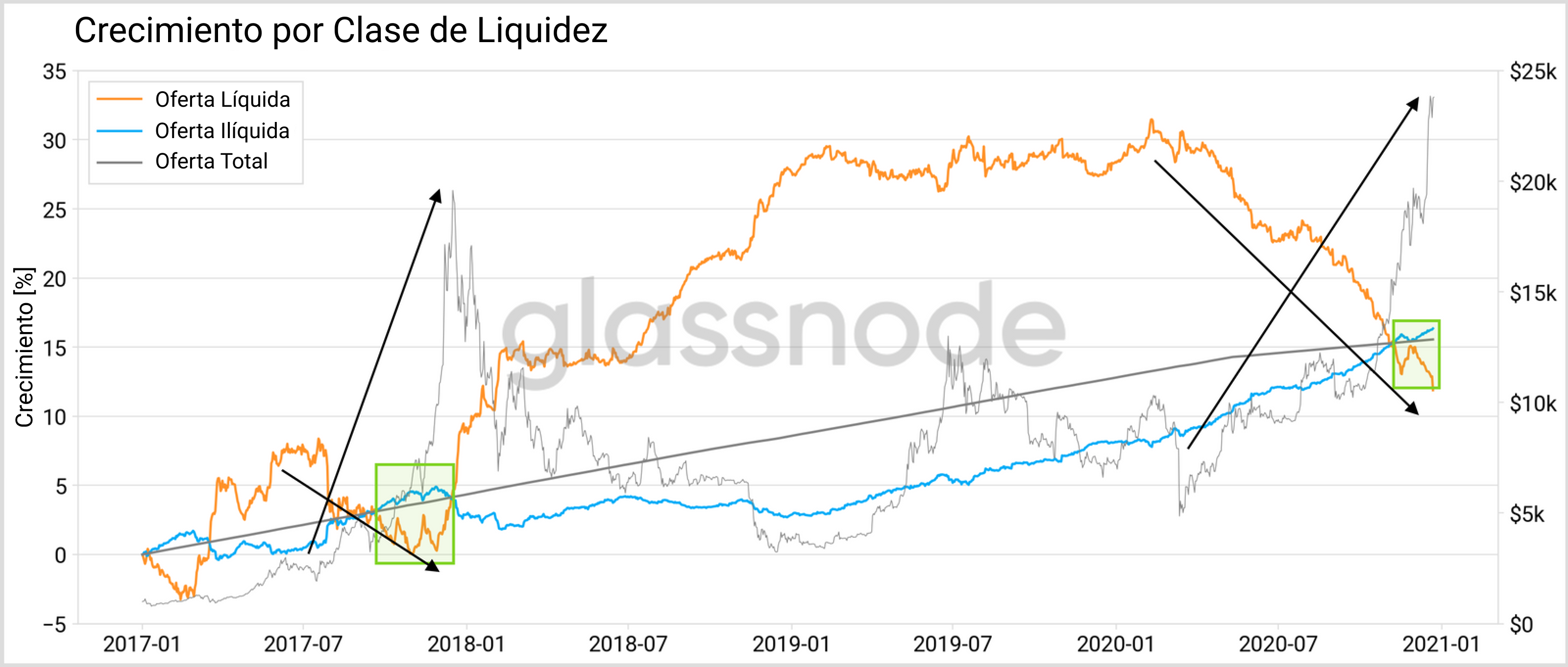 Durante los comienzos del último mercado alcista la oferta ilíquida crecía a más ritmo que la oferta total en circulación. El mismo patrón que encontramos durante el gran impulso alcista del 2017.