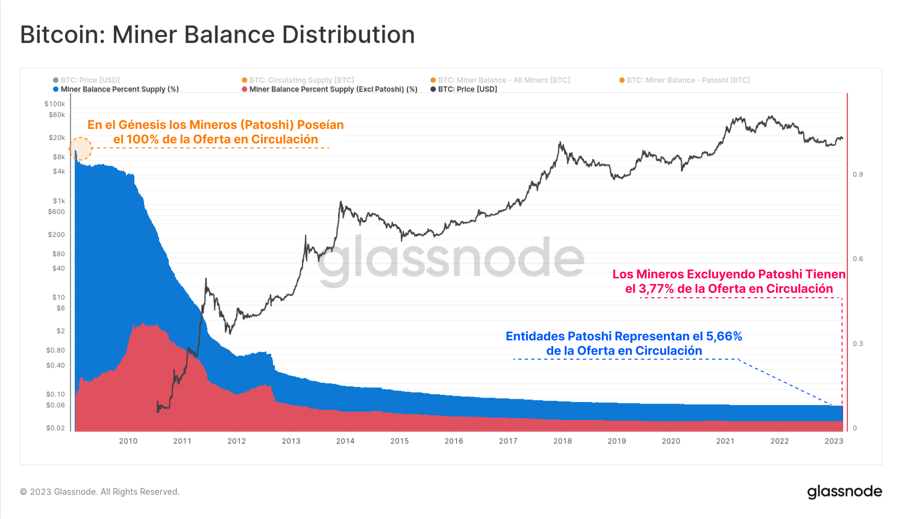 De todas las críticas que se le lanzan a Bitcoin, esta probablemente sea la más fácil de desmentir. Teniendo en cuenta el balance total en manos de los Mineros, podemos ver un declive agregado de su capital en posesión de un 100% en el momento del génesis, al escaso 9,5% de hoy en día. En realidad esta cifra es una sobreestimación de la porción de oferta en circulación que poseen los mineros, porque incluye las monedas Patoshi (que a medida que pasa el tiempo es más probable que se hayan perdido para siempre). Si desestimamos esas, vemos que el conjunto de mineros no-Patoshi tienen apenas el 3,77% de toda la oferta en circulación actual.