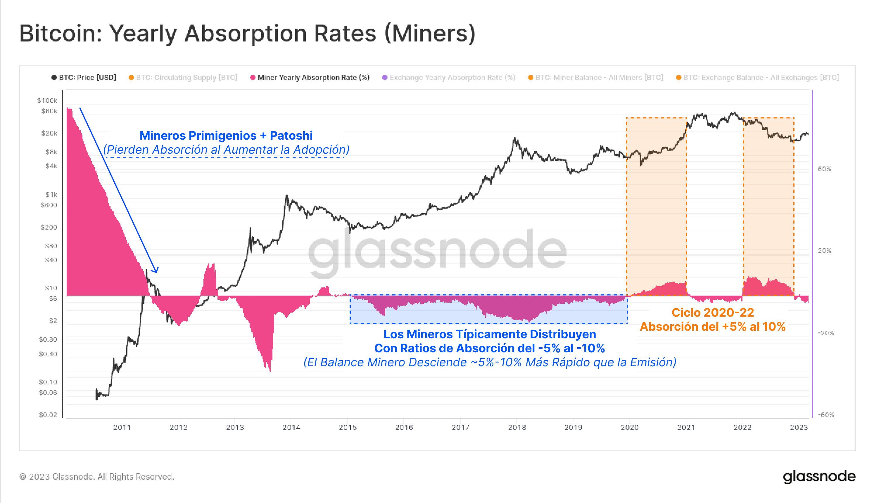 Esta gran fuerza distribuidora neta es observable también en los Ratios de Absorción Anuales de los mineros, donde por lo general, el balance de este conglomerado se reduce en un factor de 1,05 a 1,1 BTC por cada 1,0 BTC que se mina. Es la viva imagen de cómo gastan gradualmente el balance que han ido acumulando todos los mineros juntos a lo largo de la historia.