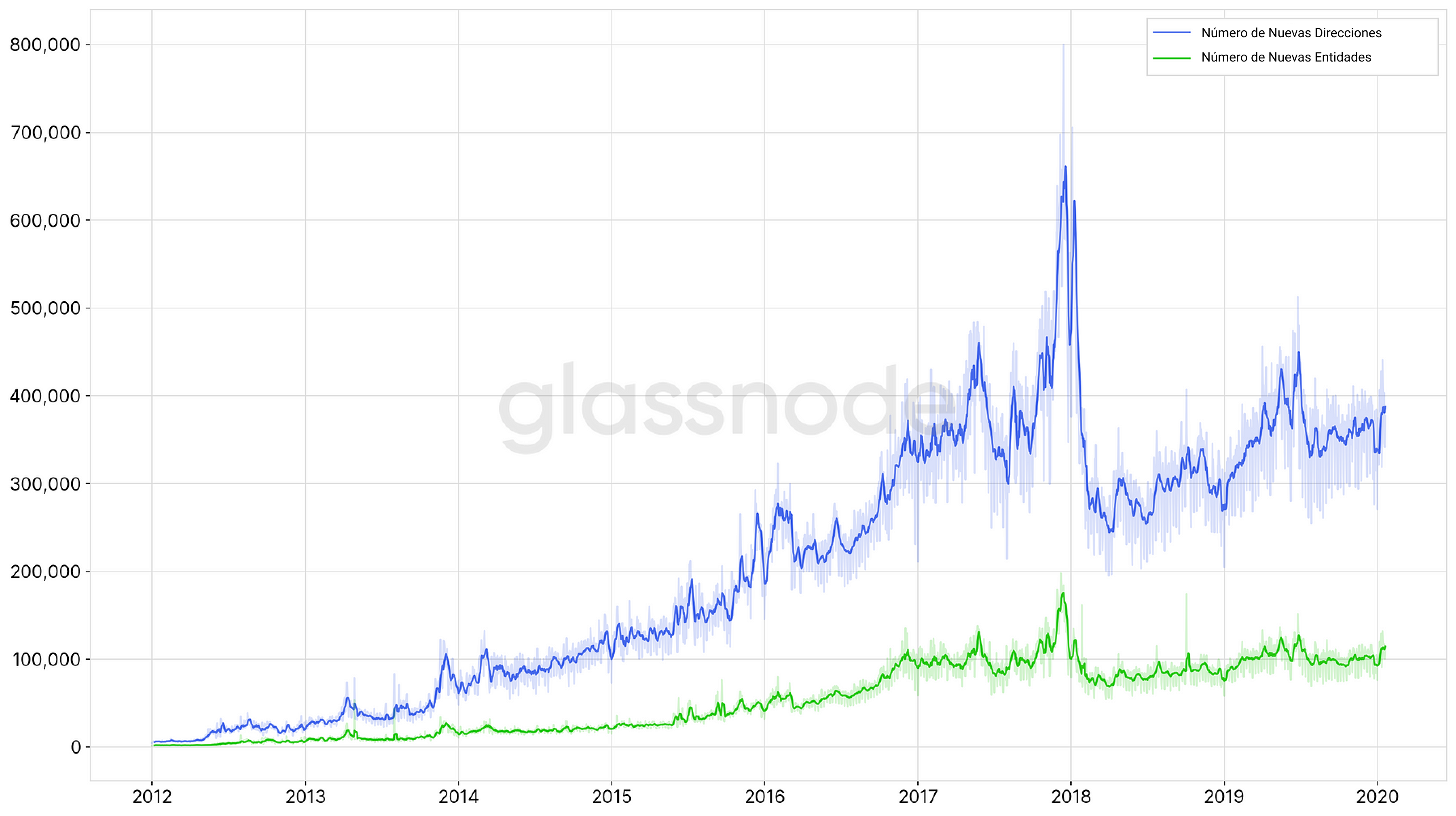 La Figura 1 muestra la cantidad de nuevas entidades que llegan al network de Bitcoin cada día—junto a la cantidad de nuevas direcciones para compararlo.
