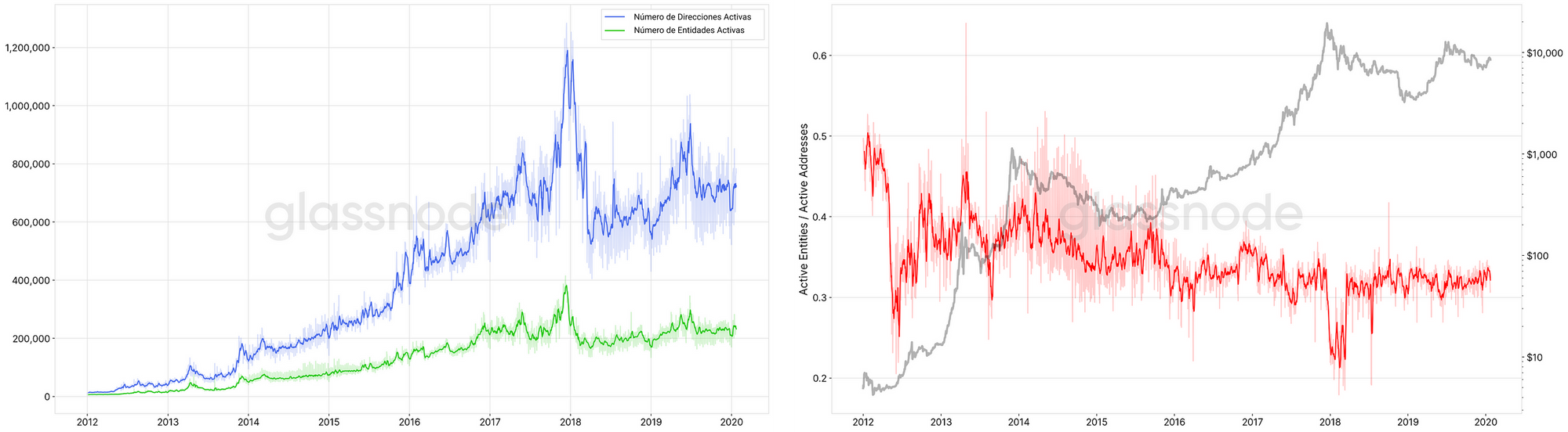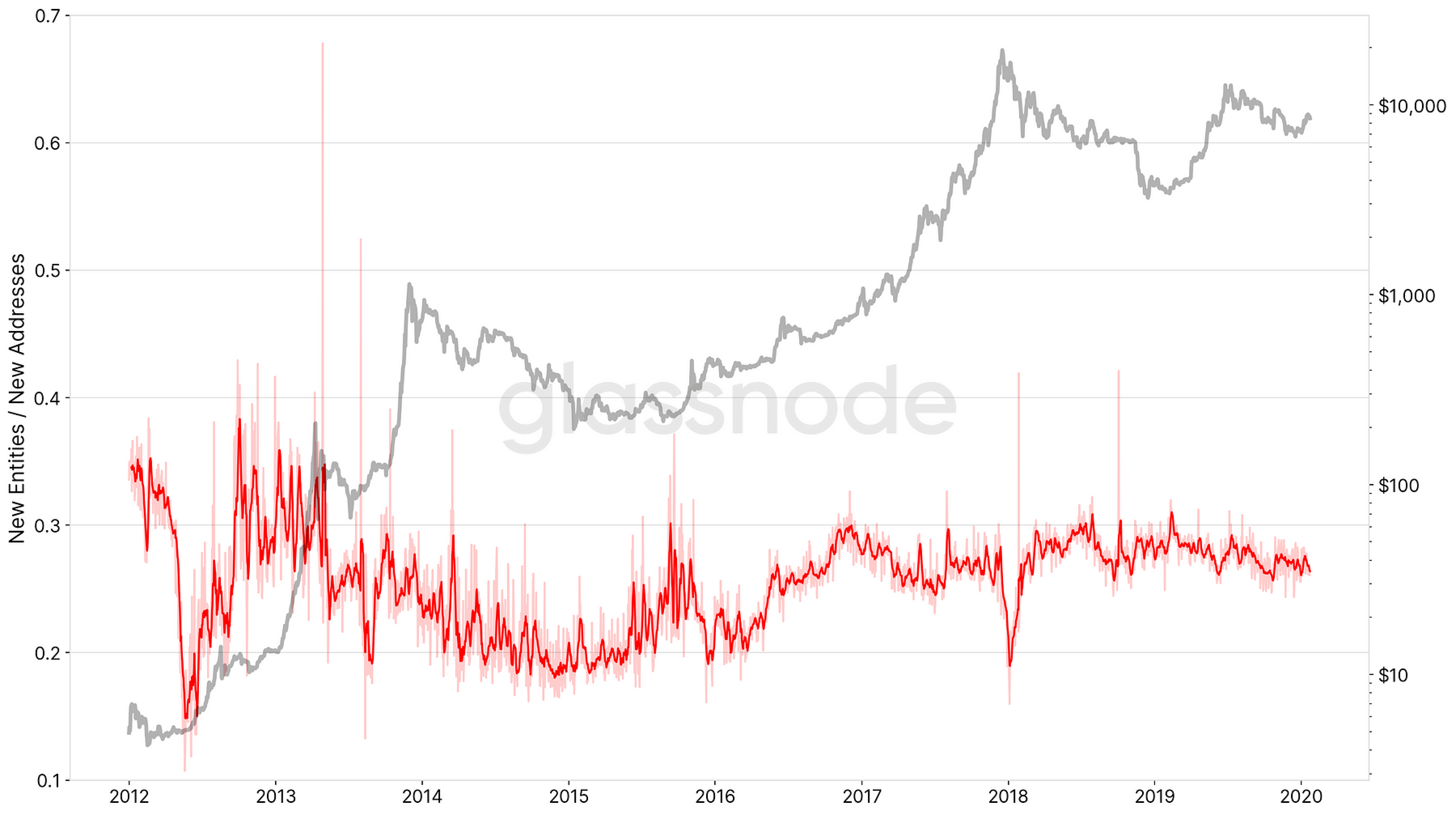 Hay que destacar la posible señal a la que apunta este ratio. Por ejemplo, hay un claro pico descendente a comienzos del 2018 que deja entrever una mayor discrepancia entre nuevas direcciones y nuevas entidades, sugiriendo que los usuarios ya existentes tenían comparativamente más actividad (p.ej. muchas nuevas direcciones en realidad eran producto de un cambio de direcciones), y no nuevos participantes entrando en el network.