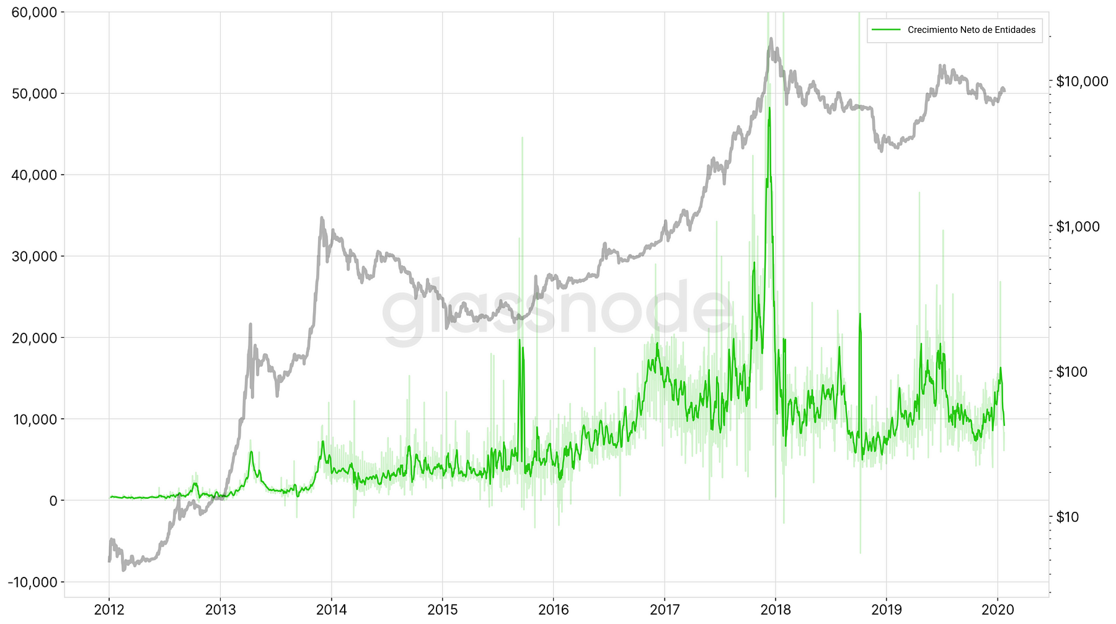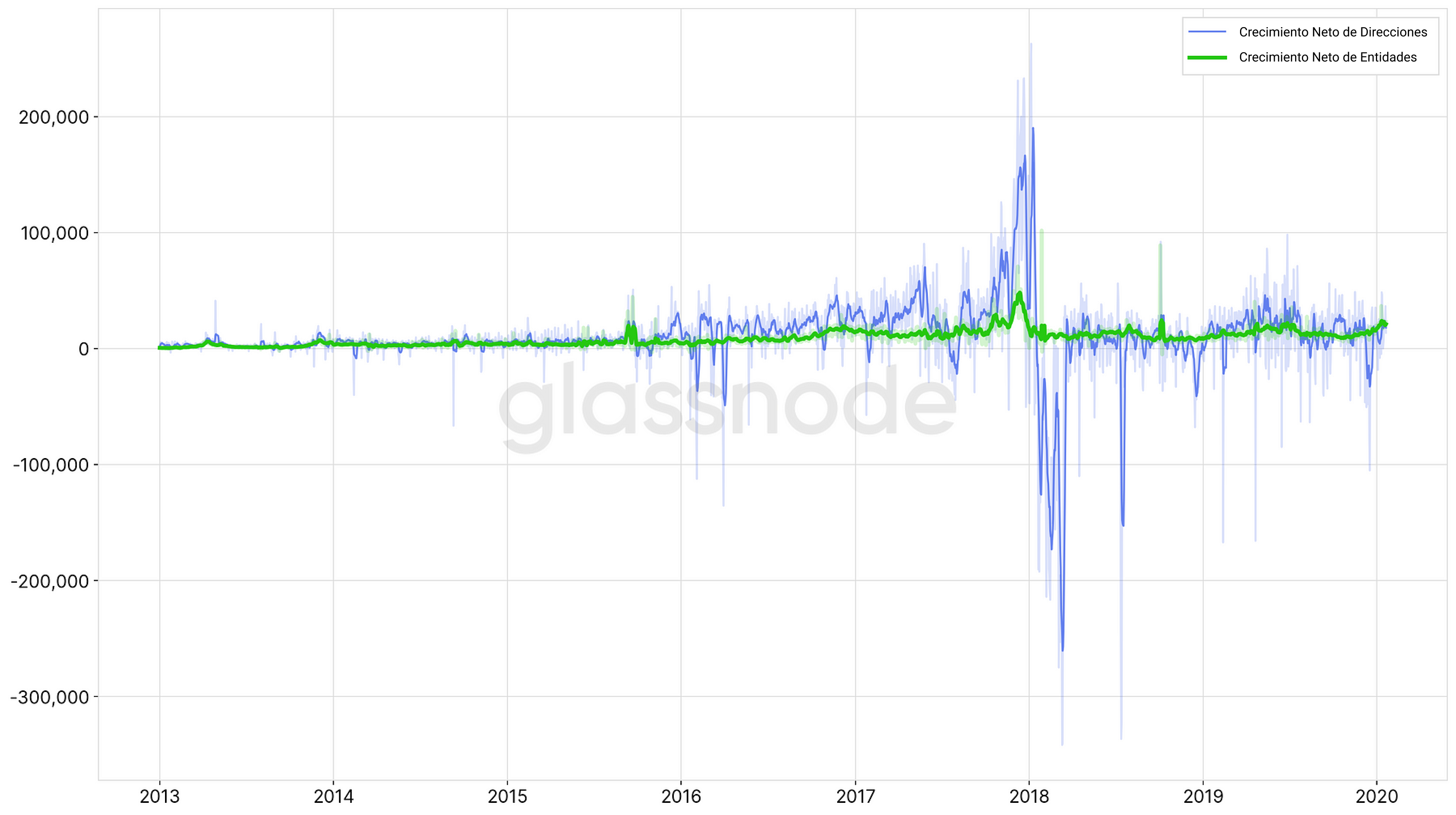 La cantidad de entidades únicas que aparecen por primera vez en una transacción del network de Bitcoin. - Crecimiento Neto de Entidades