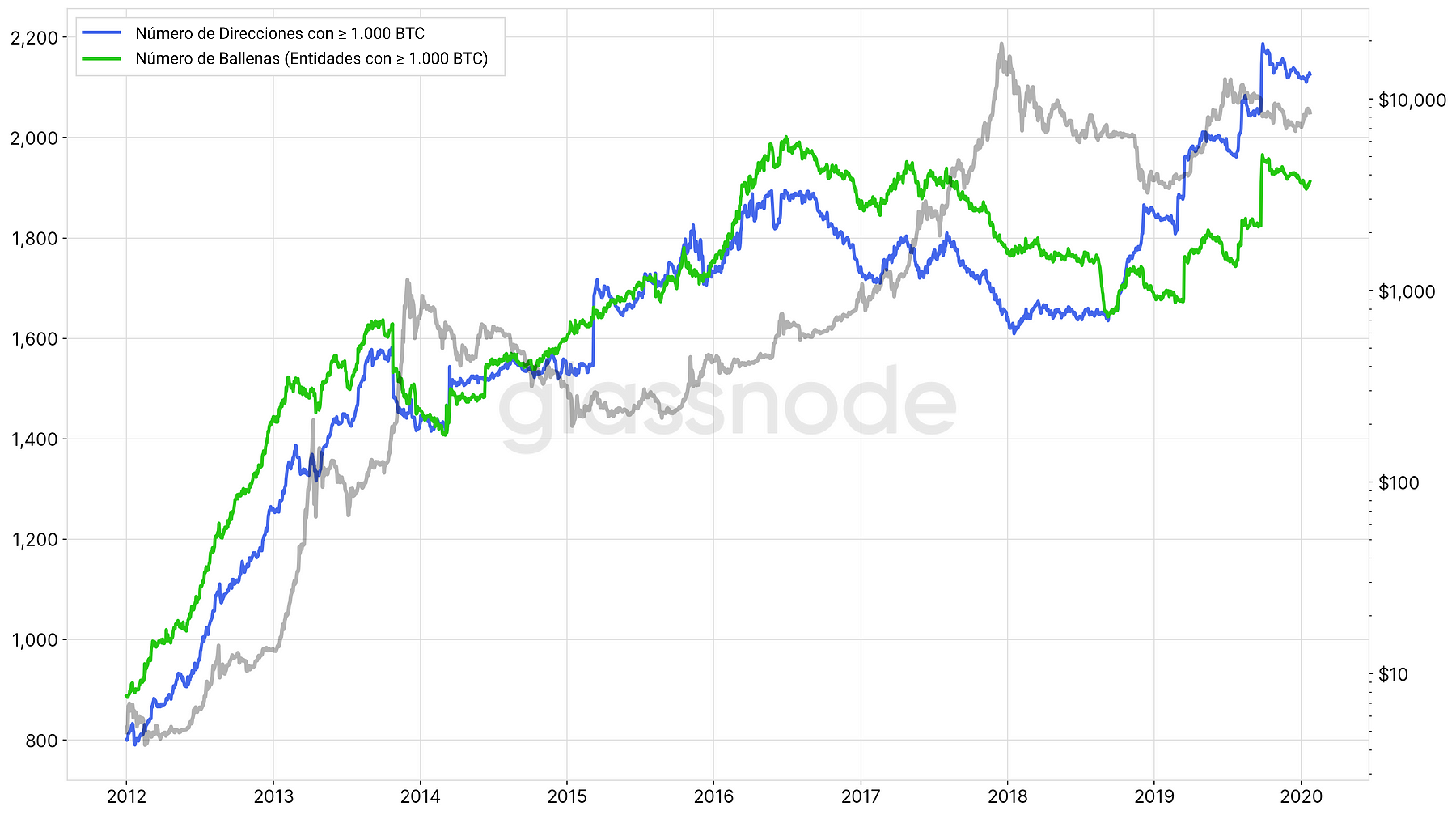 El crecimiento neto de entidades únicas en la red. Esta métrica se define como la diferencia entre las entidades nuevas y las entidades que “desaparecen” (entidades con balance cero que previamente tuvieron algo distinto a cero en su anterior registro). - Número de Ballenas