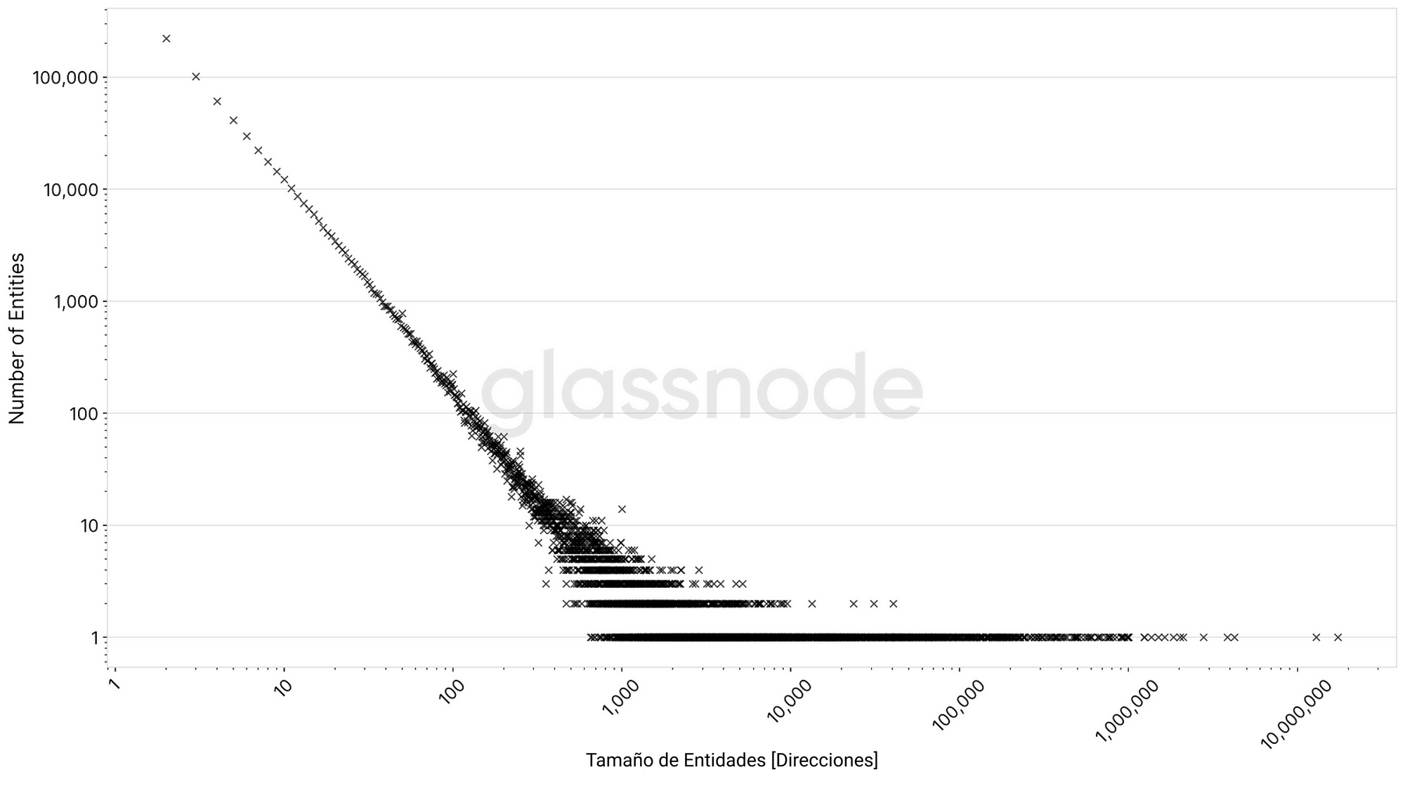 La gráfica muestra una clarísima relación de poder, en la que el tamaño de estas entidades oscila desde una única dirección, hasta entidades compuestas por constelaciones enteras de casi 22 millones de direcciones (Coinbase).