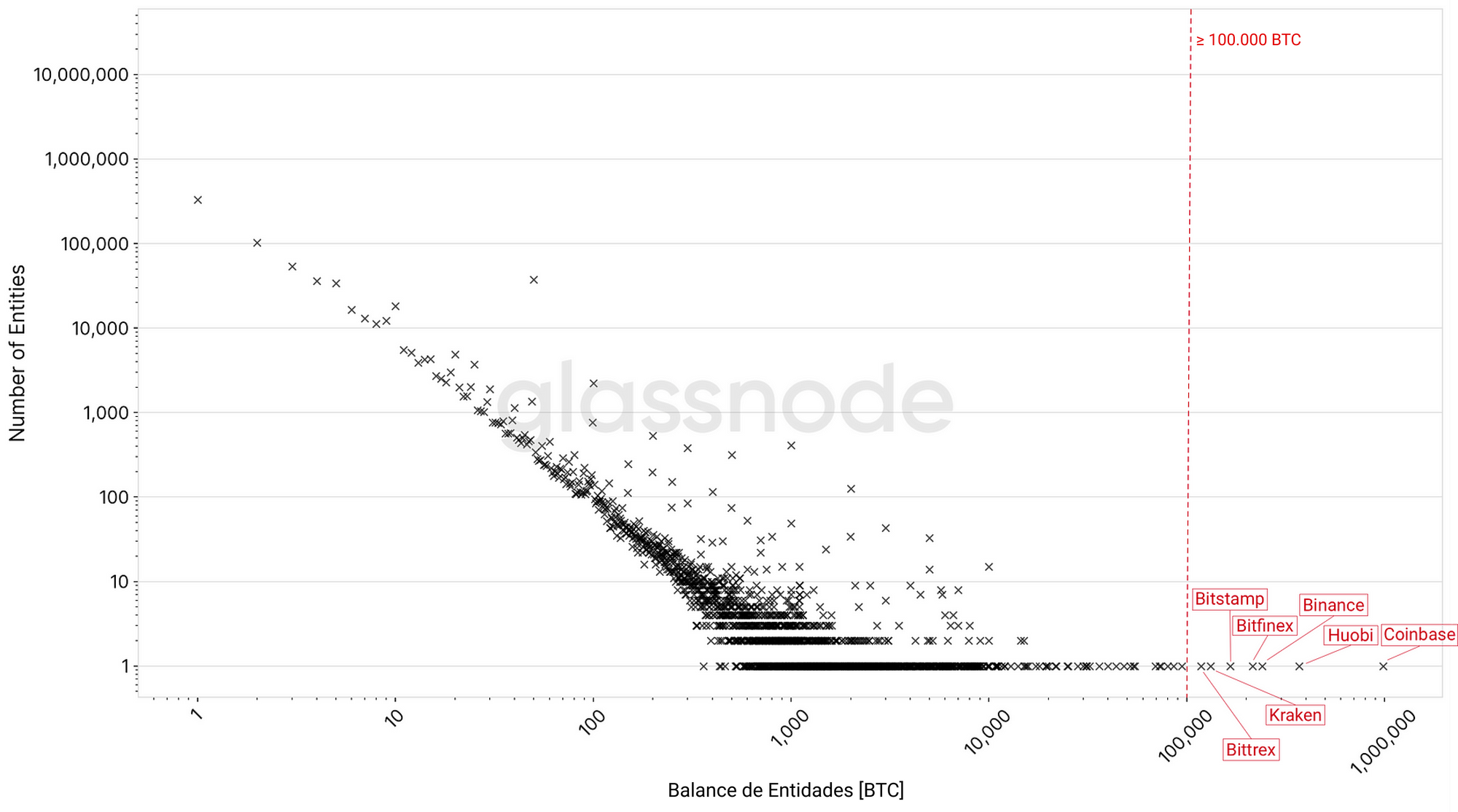 Respecto a las entidades más grandes, a fecha de enero del 2020, había 75 entidades con 10.000 BTC o más, y 7 con 100.000 BTC o más—todas ellas son exchanges. Coinbase (983.800 BTC), Huobi (369.100 BTC), Binance (240.700 BTC), Bitfinex (214.600 BTC), Bitstamp (165.400 BTC), Kraken (132.100 BTC) y Bittrex (118.100 BTC).