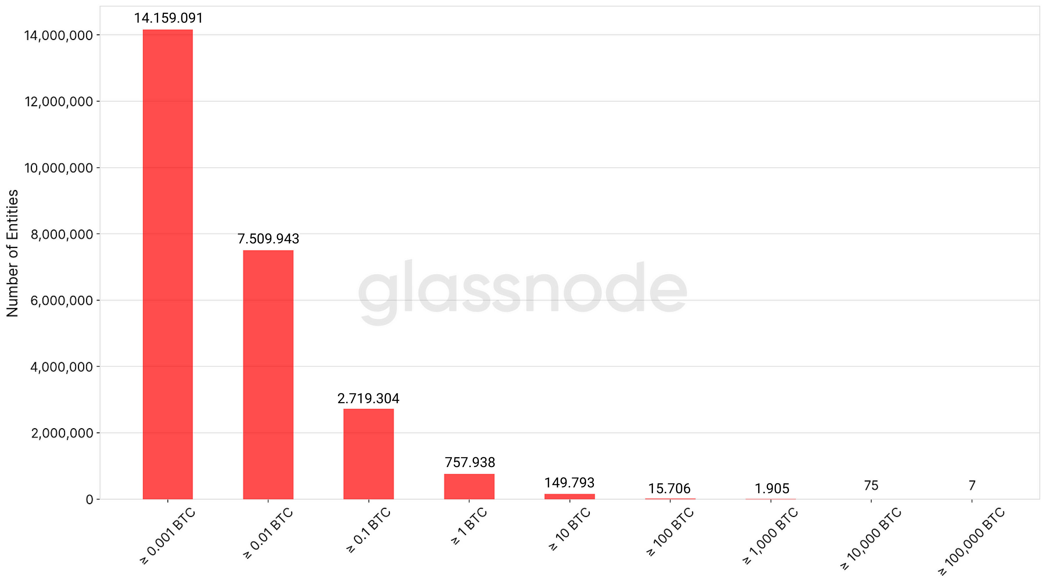 De igual forma, el número de nuevas entidades en función de su balance revela una distribución en la que el grueso de las entidades (~22,3 millones) tienen menos de un Bitcoin (omitidas en la distribución de la siguiente gráfica).
