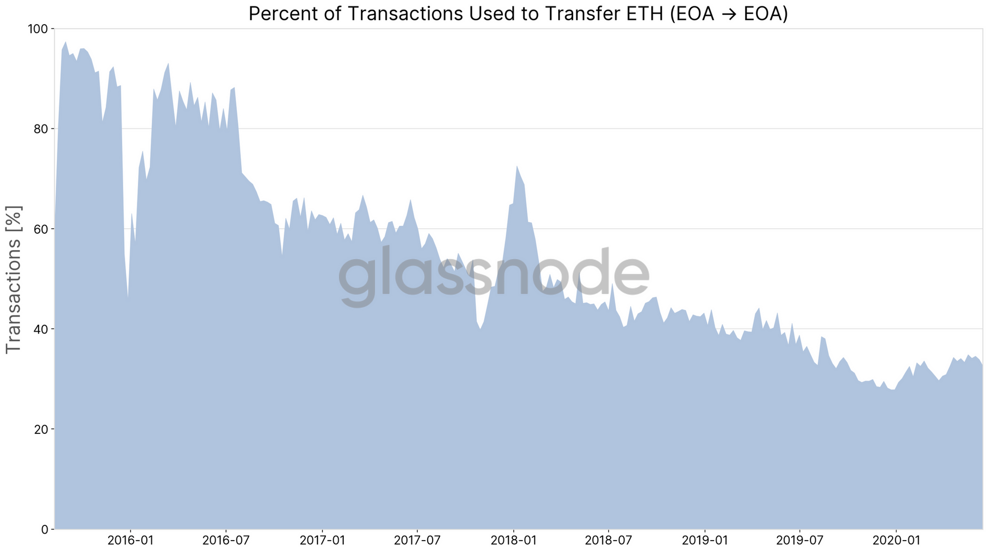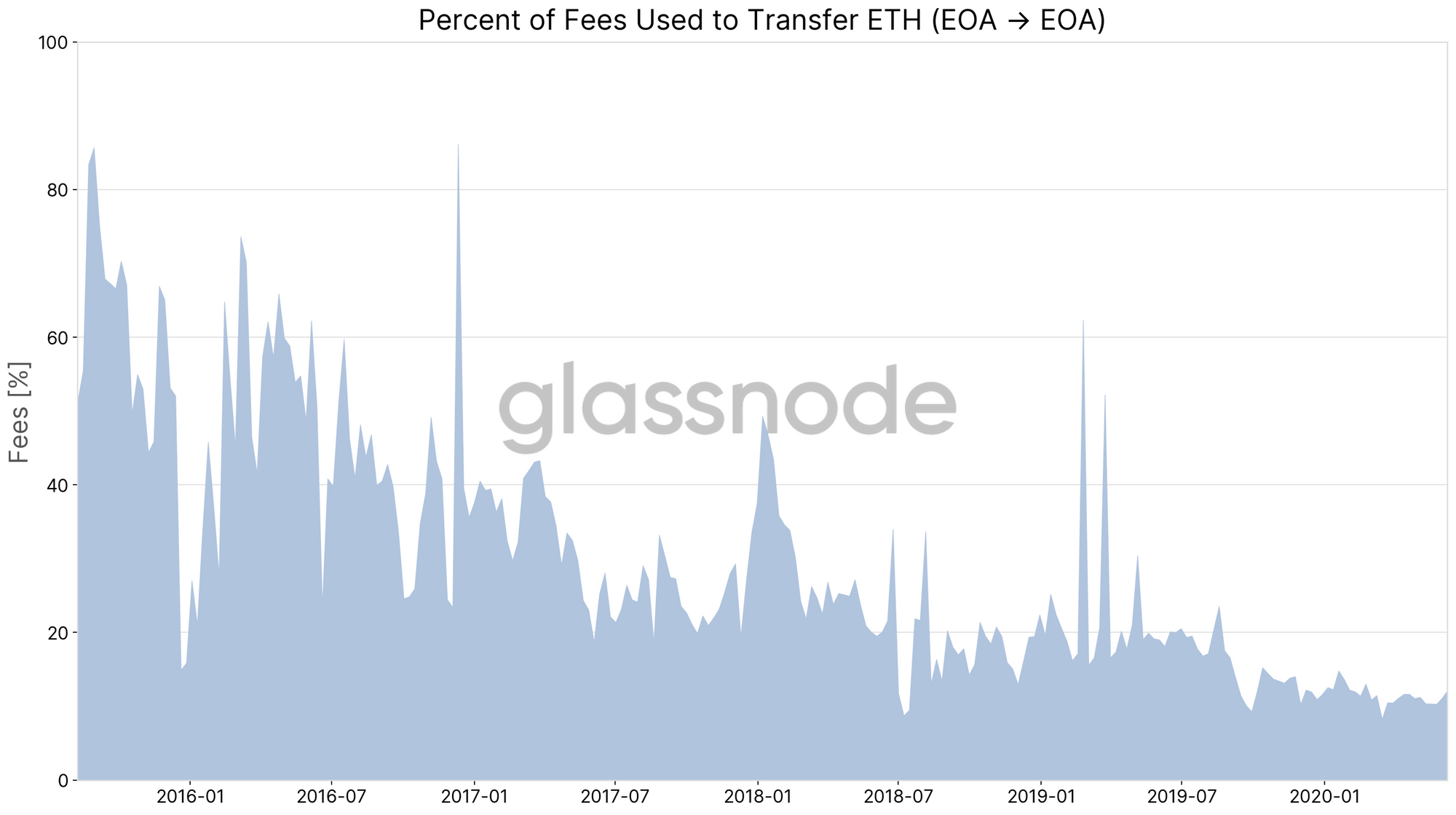 En mayo del 2020 teníamos algo más de un tercio (34,2%) de las transacciones del network siendo destinadas a transferir ETH entre cuentas externas, y sin embargo sólo se utilizaba el 10,7% del total de comisiones para este fin.