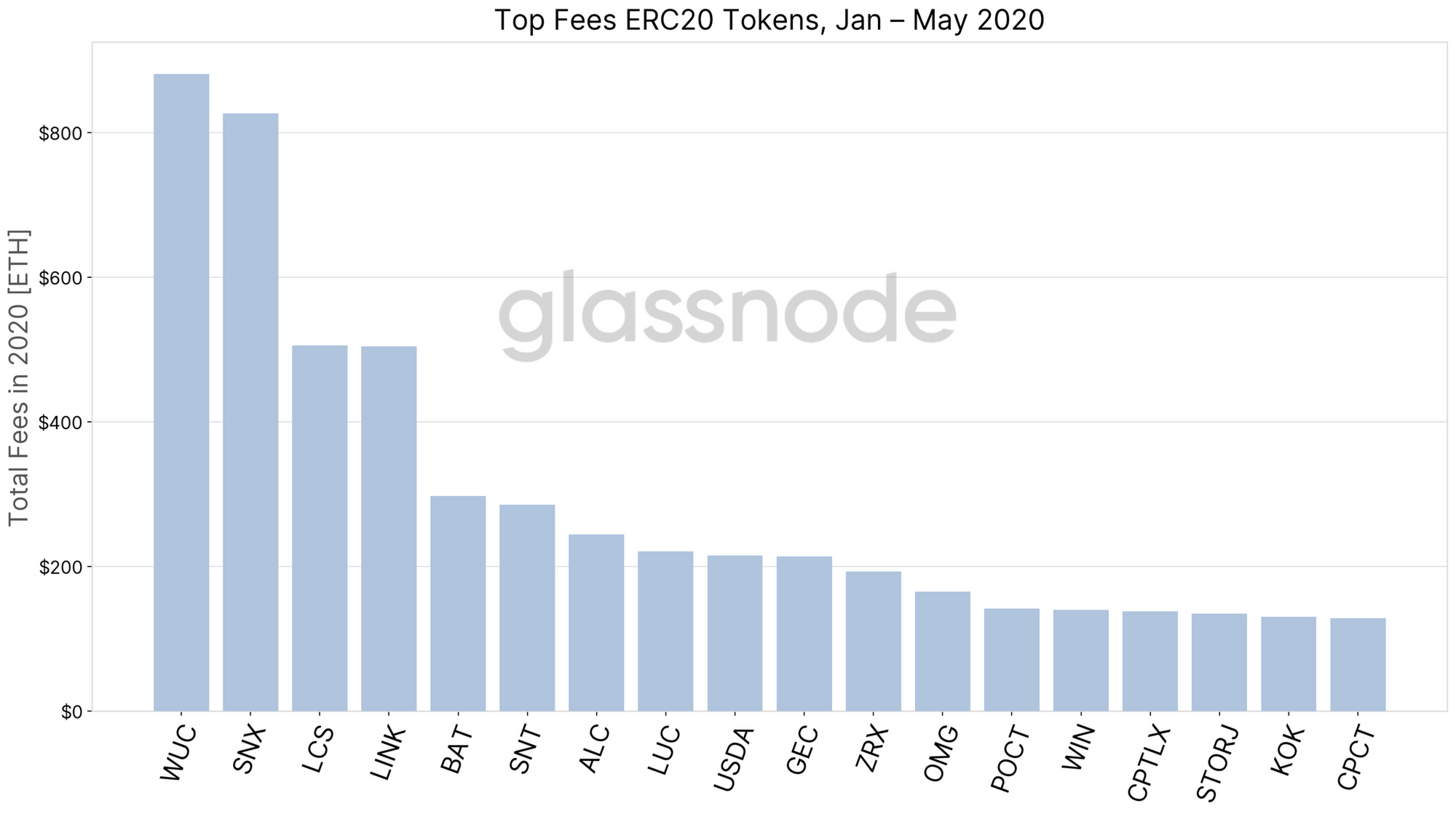 Los principales tokens ERC20 (excluyendo a USDT) que más comisiones consumen se muestran en la Figura 7, estando a la cabeza del ránking WUC, SNX, LCS, LINK, y BAT.